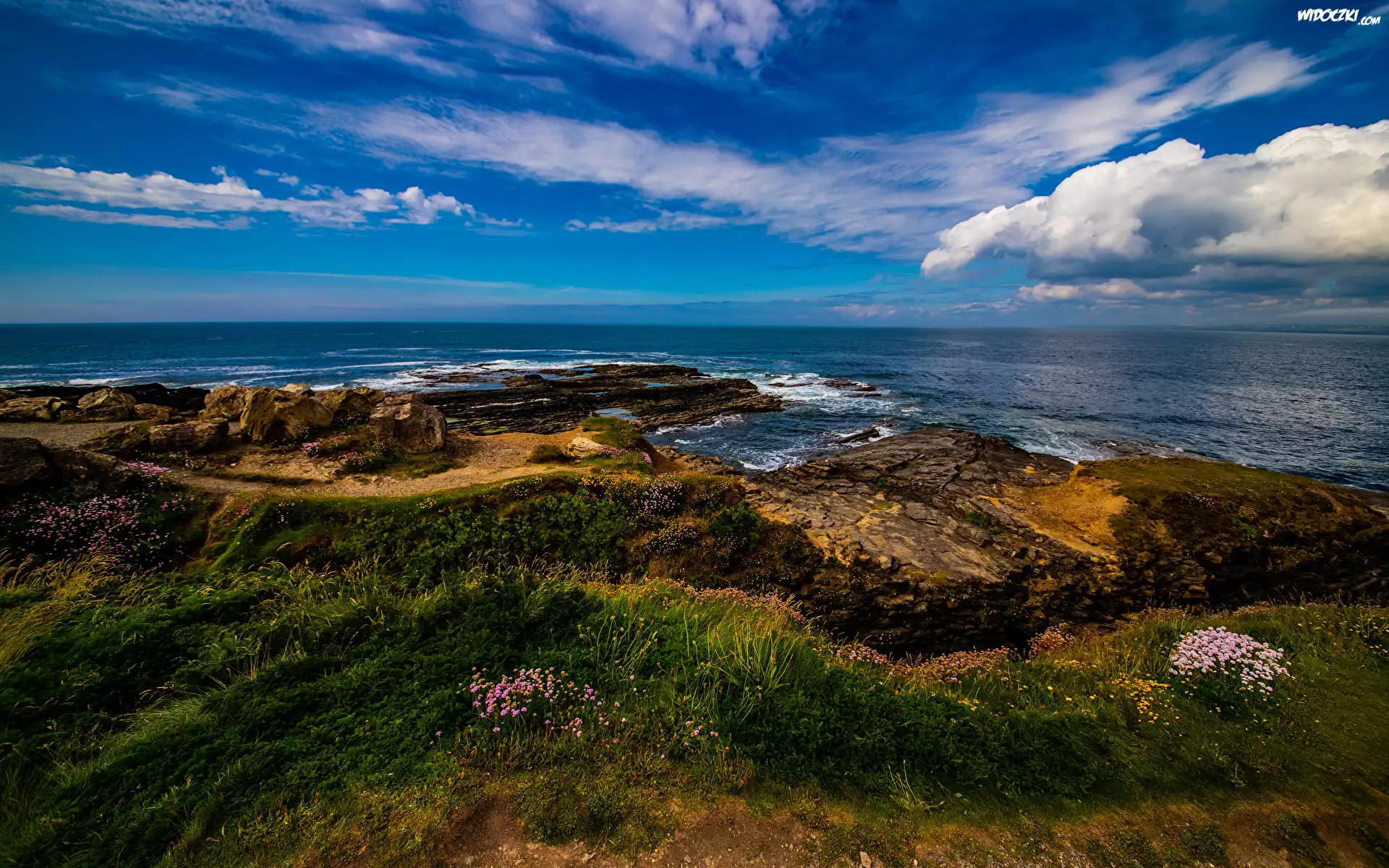 Zdjęcia, Wybrzeże, Kwiaty, Rośliny, Morze, Chmury