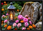 Lampion, Kwiaty, Róże, Aksamitki, Kamień