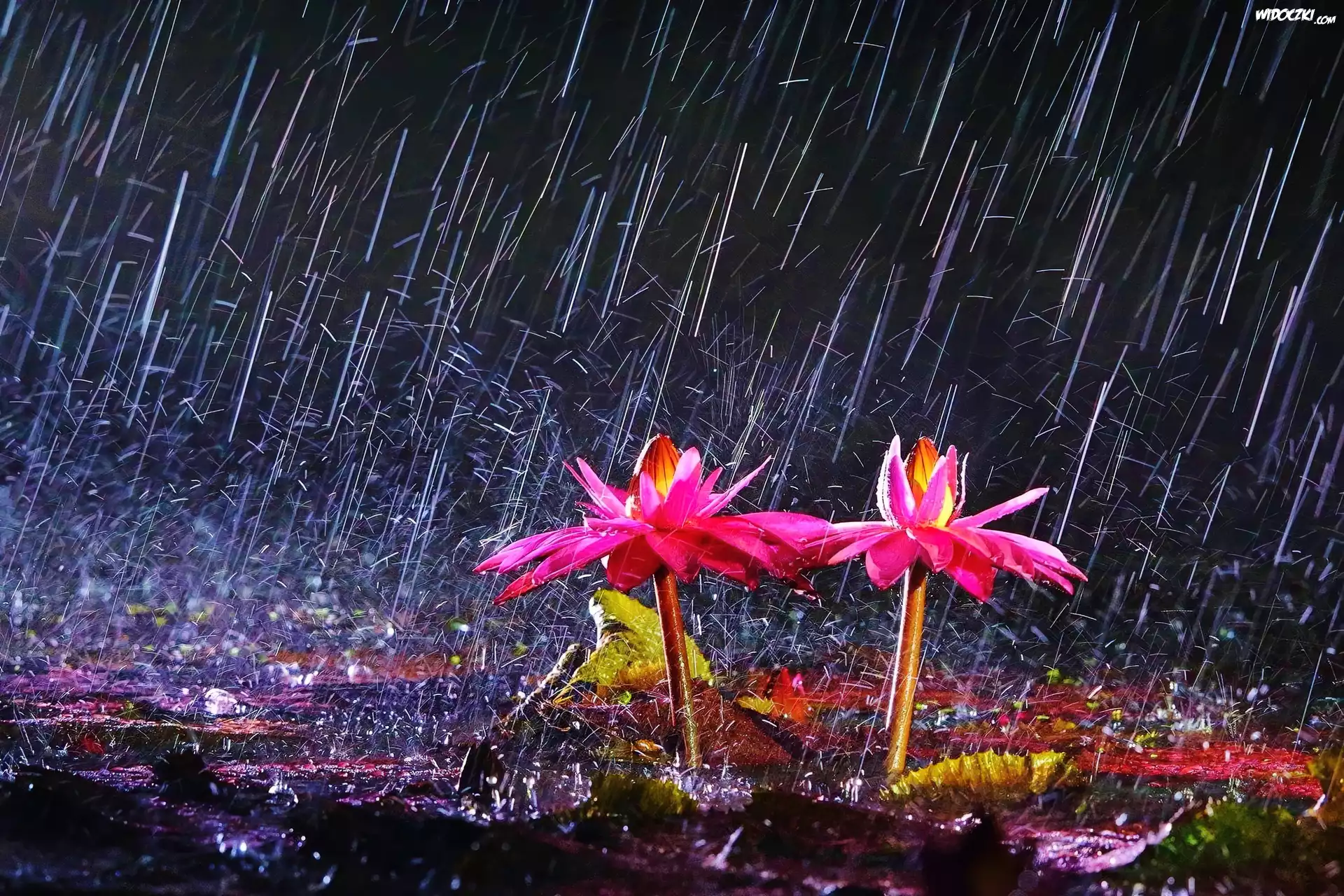 Zdjęcia, Różowe, Kwiaty, Deszcz
