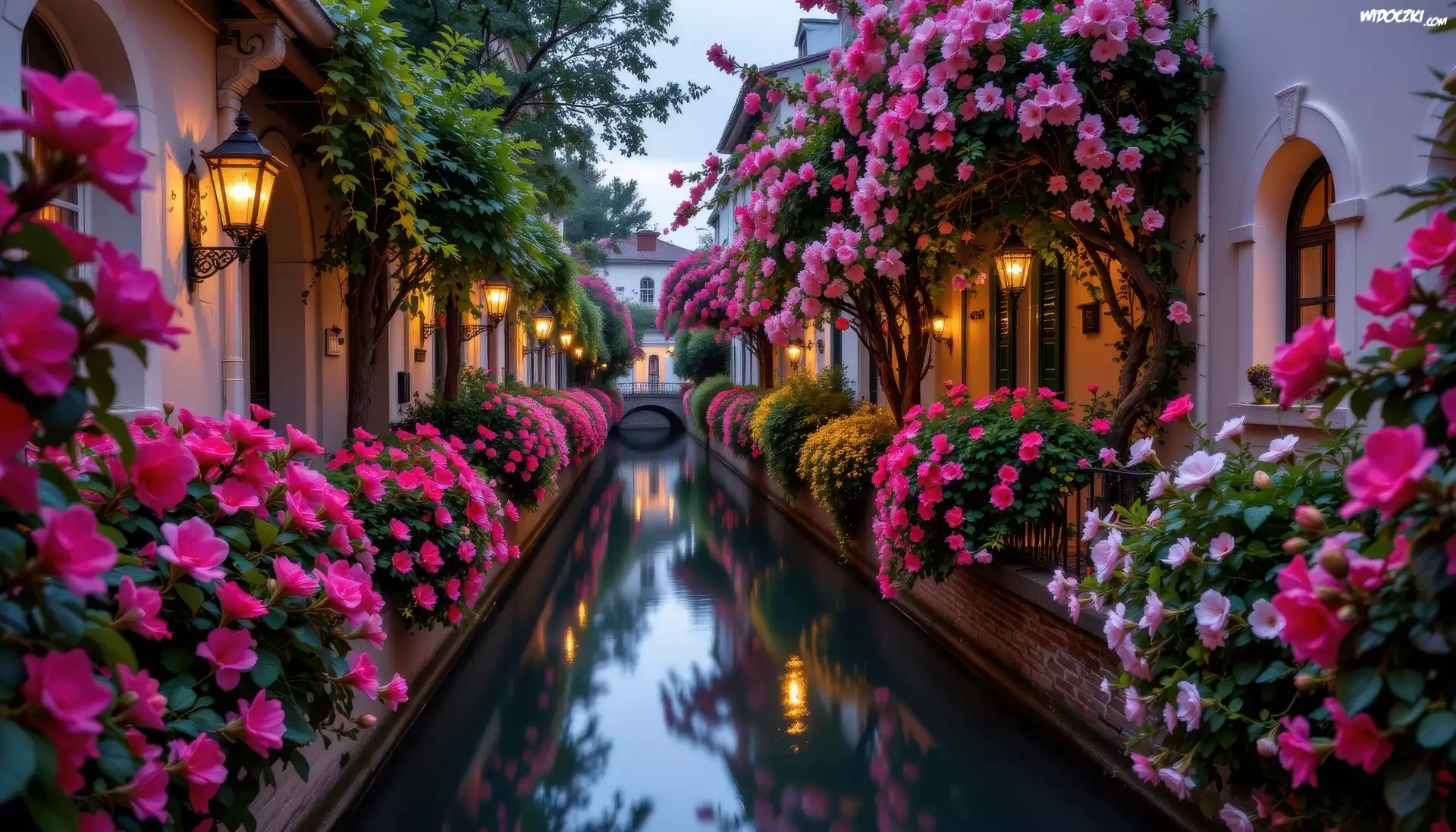 Kanał, Mostek, Kwiat, Kwiaty, Budynki Rzeka
