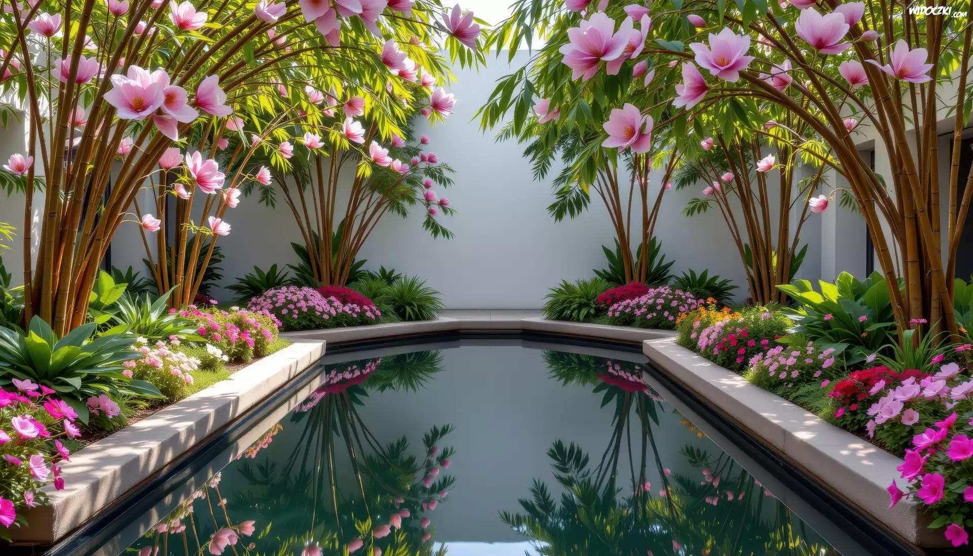 Zdjęcia, Rabaty, Kwiaty, Sadzawka, Ogród, Grafika