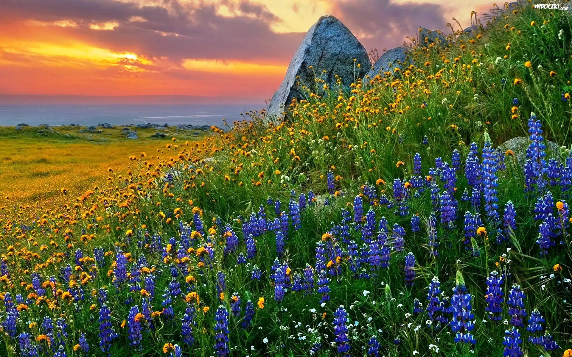 Łąka, Skały, Kwiaty, Łubin