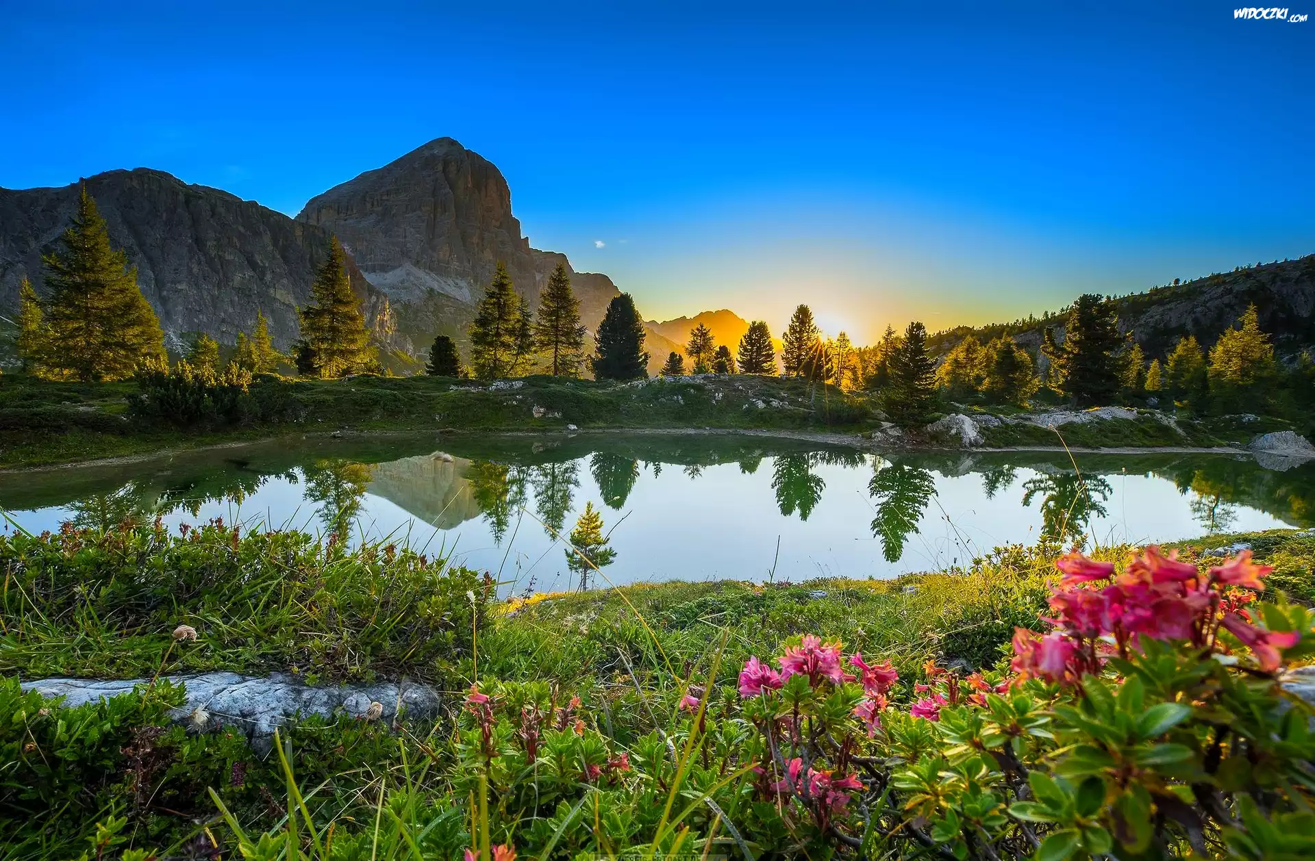 Zdjęcia, Kwiaty, Staw, Góry, Wschód słońca, Odbicie