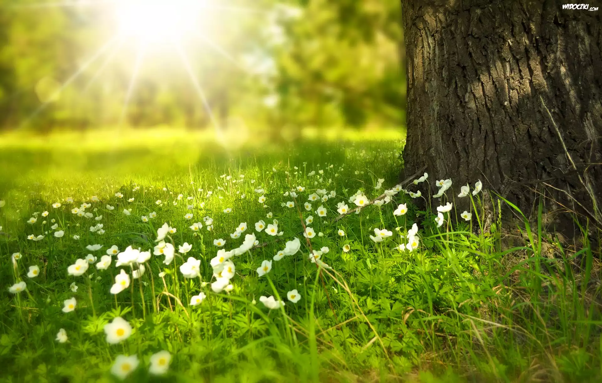 Kwiaty, Drzewo, Promienie, Słońca, Wiosna