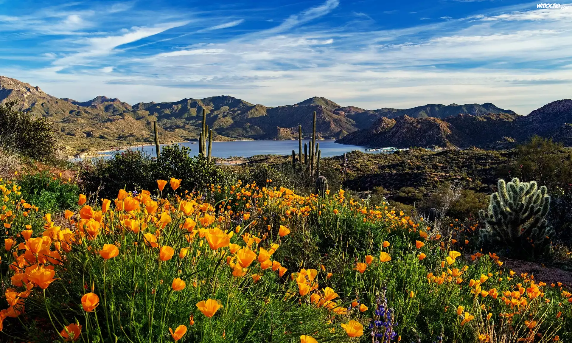 Zdjęcia, Kwiaty, Pozłotki kalifornijskie, Kaktusy, Jezioro Bartllet, Góry, Arizona, Stany Zjednoczone