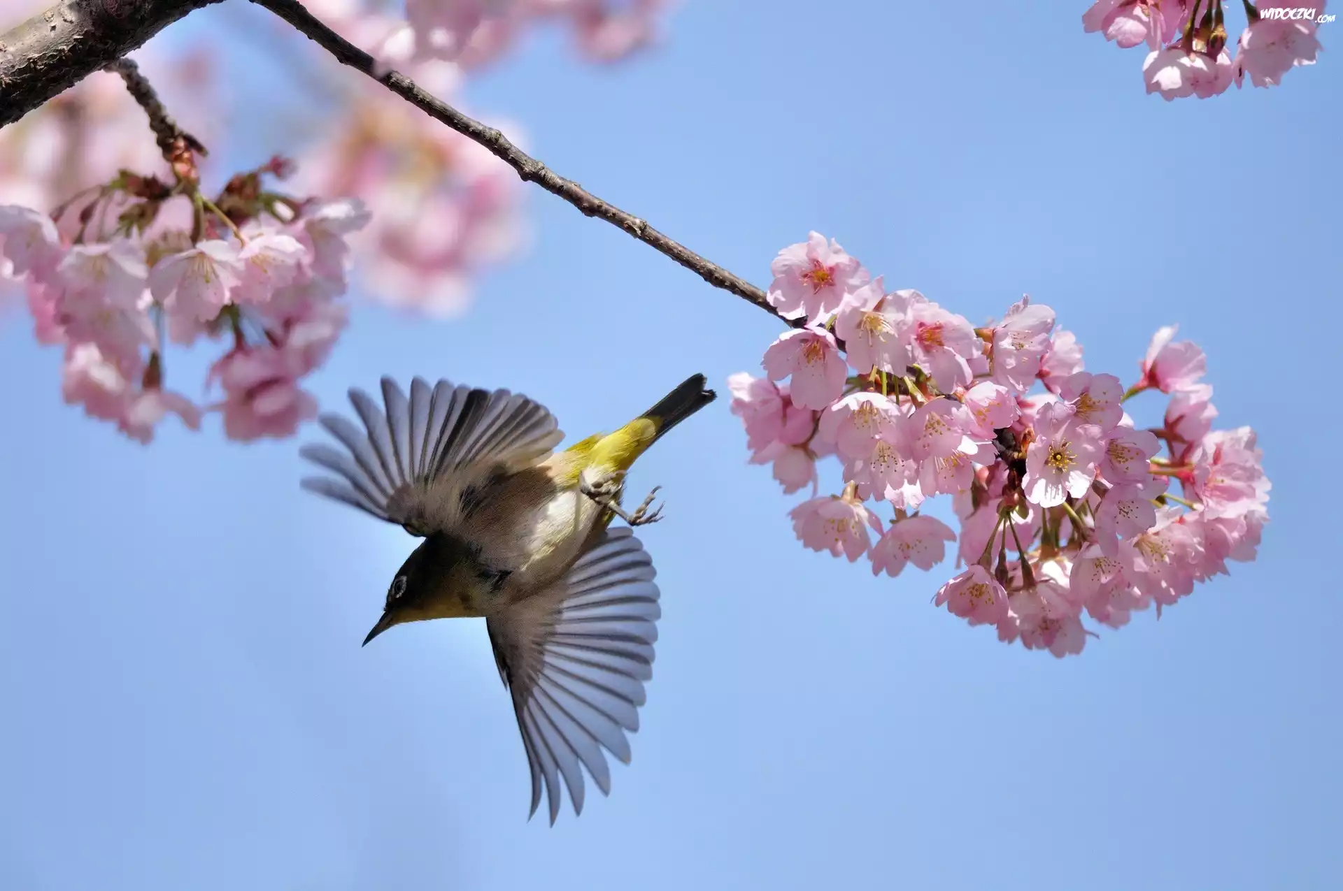 Zdjęcia, Kwitnąca, Gałązka, Wiśni, Ptaszek, Lot