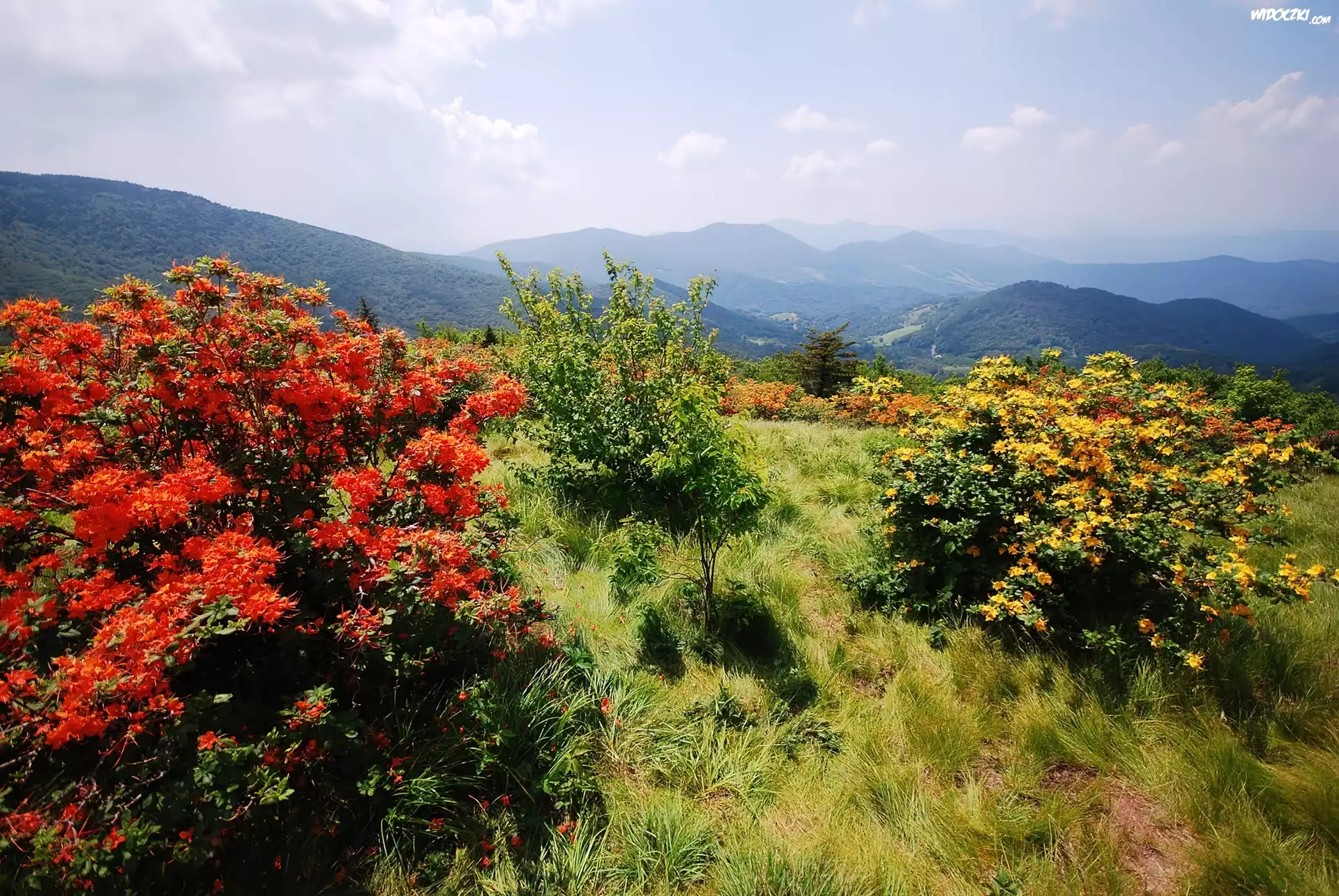 Zdjęcia, Kwitnące, Azalie, Różaneczniki, Łąka, Góry, Wzgórza