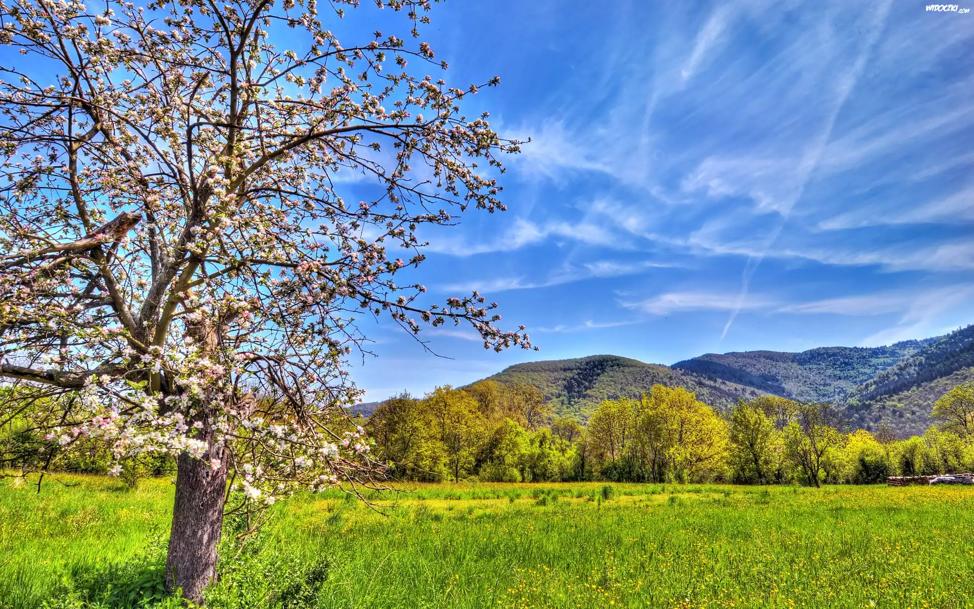Zdjęcia, Kwitnące, Drzewo, Łąka, Góry