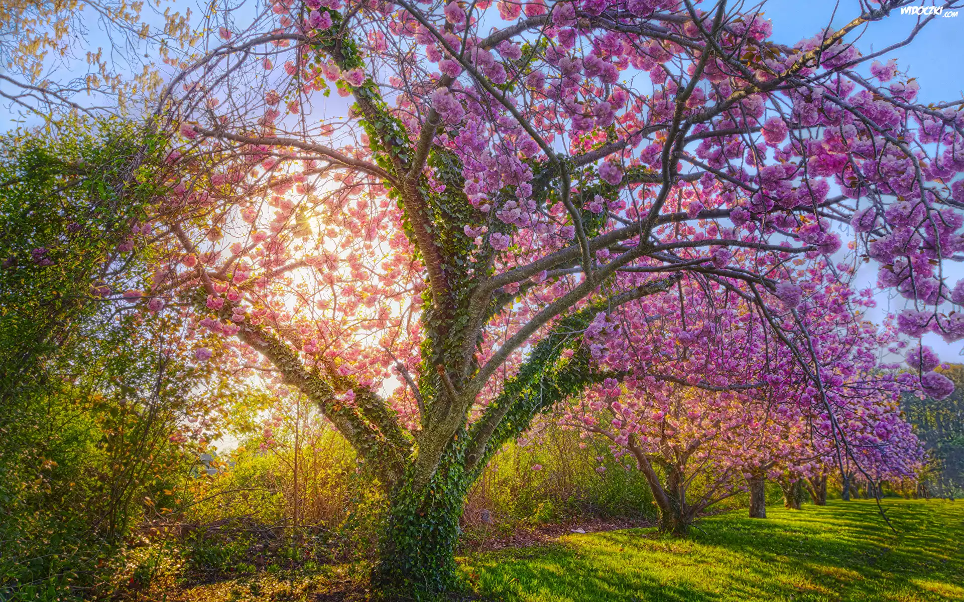 Kwitnące, Drzewa, Wiosna, Trawa, Blask, Słońca