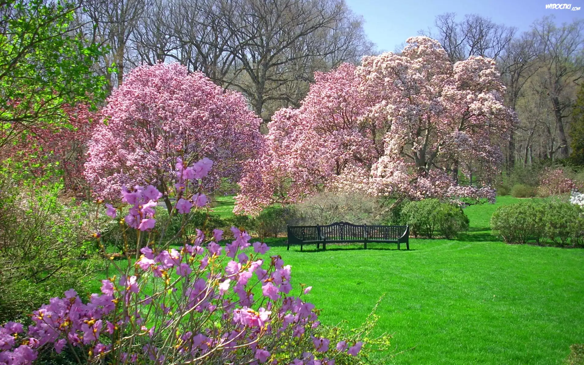 Zdjęcia, Kwitnące, Drzewa, Ławka, Kwiaty, Park, Wiosna