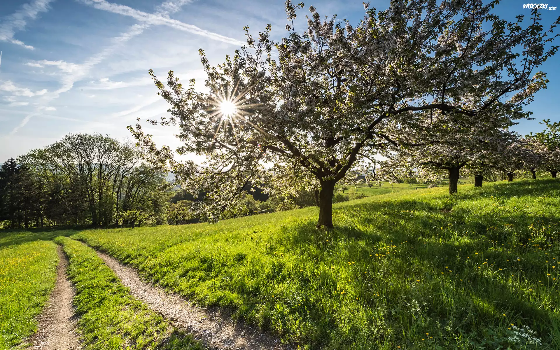 Zdjęcia, Wiosna, Kwitnące, Drzewa, Sad, Droga, Trawa, Promienie słońca