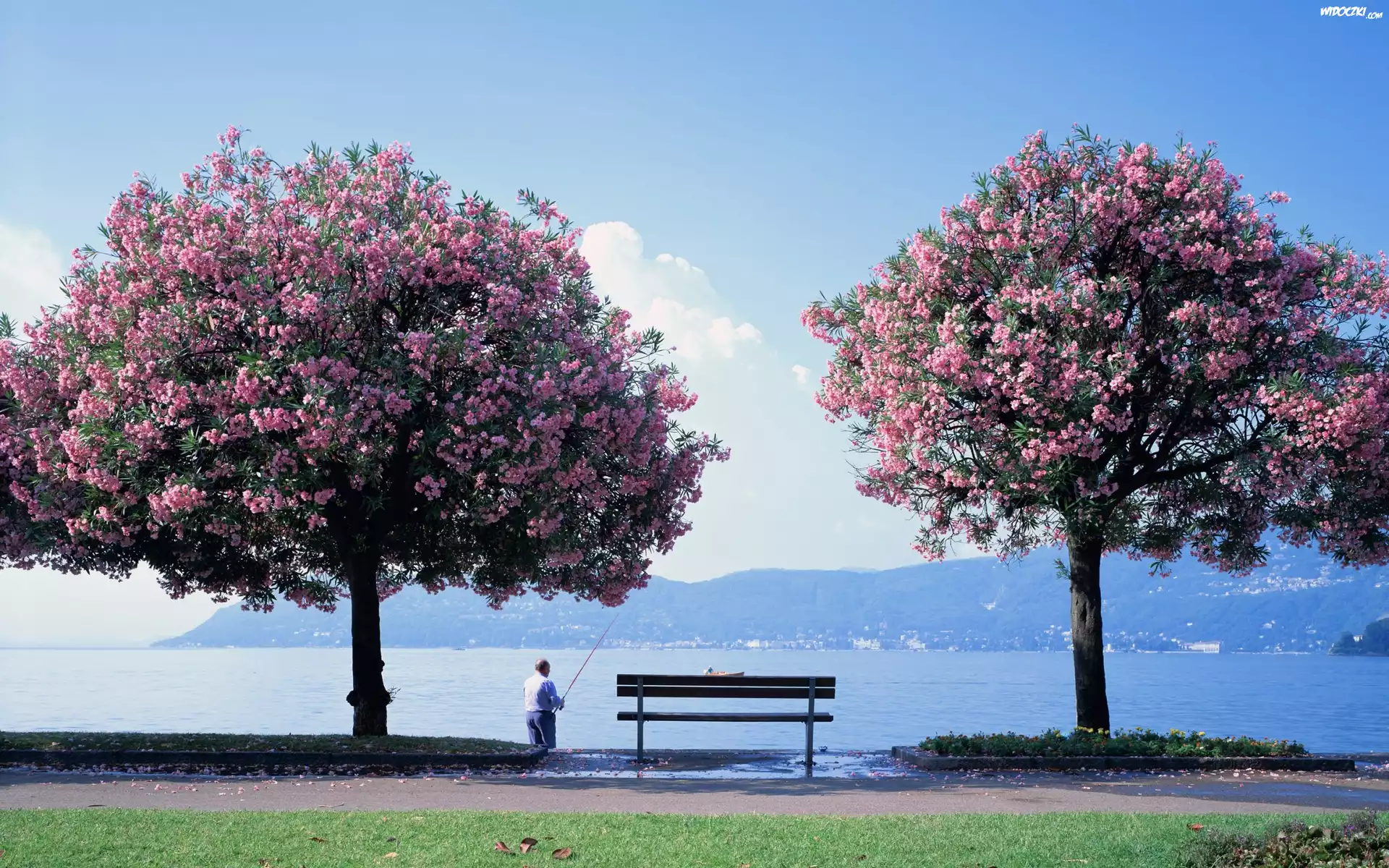 Kwitnące, Drzewa, Jezioro, Góry, Wędkarz, Wiosna