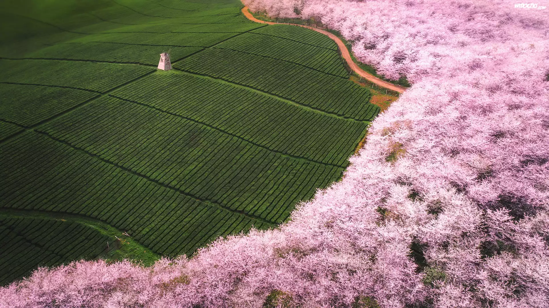 Zdjęcia, Kwitnące, Drzewa, Plantacja, Herbaty, Wiatrak, Wiosna