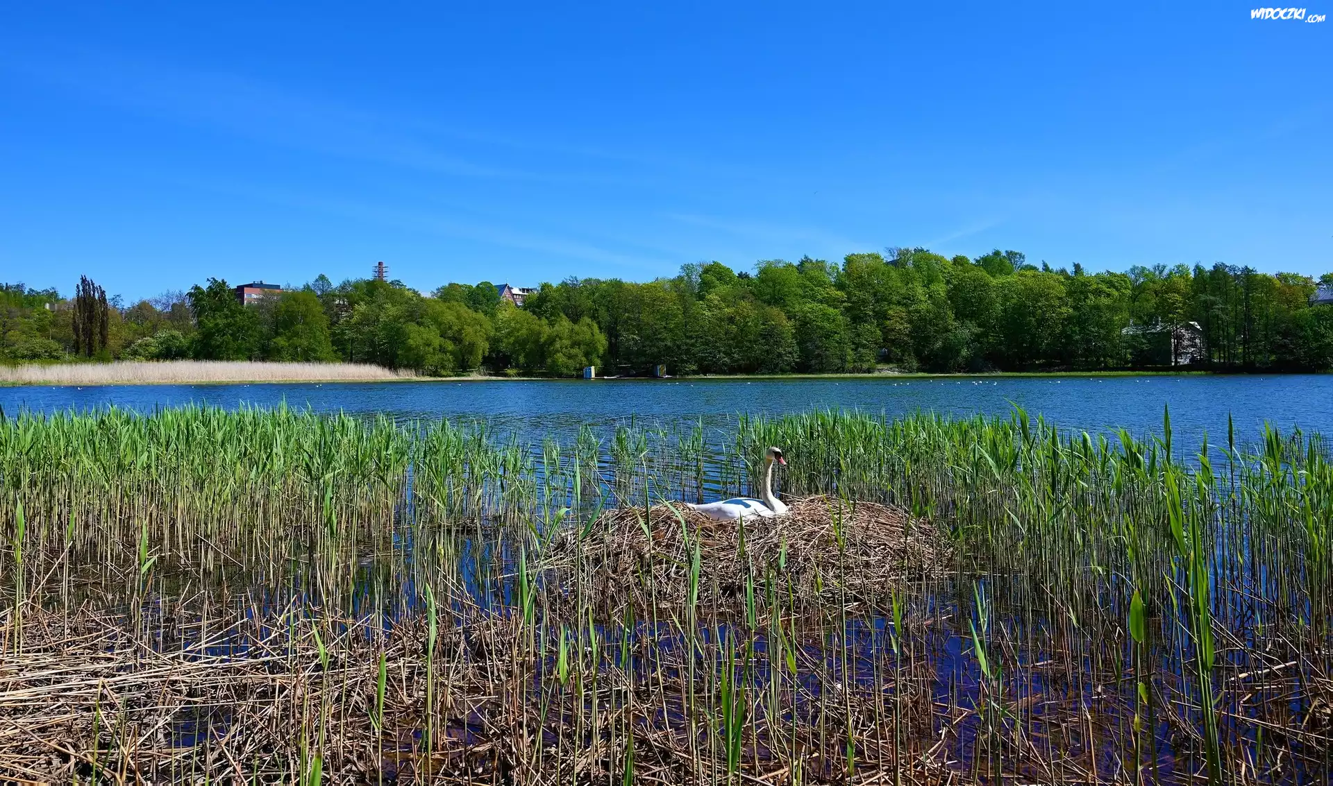 Zdjęcia, Jezioro, Trawa, Szuwary, Łabędź, Gniazdo, Drzewa