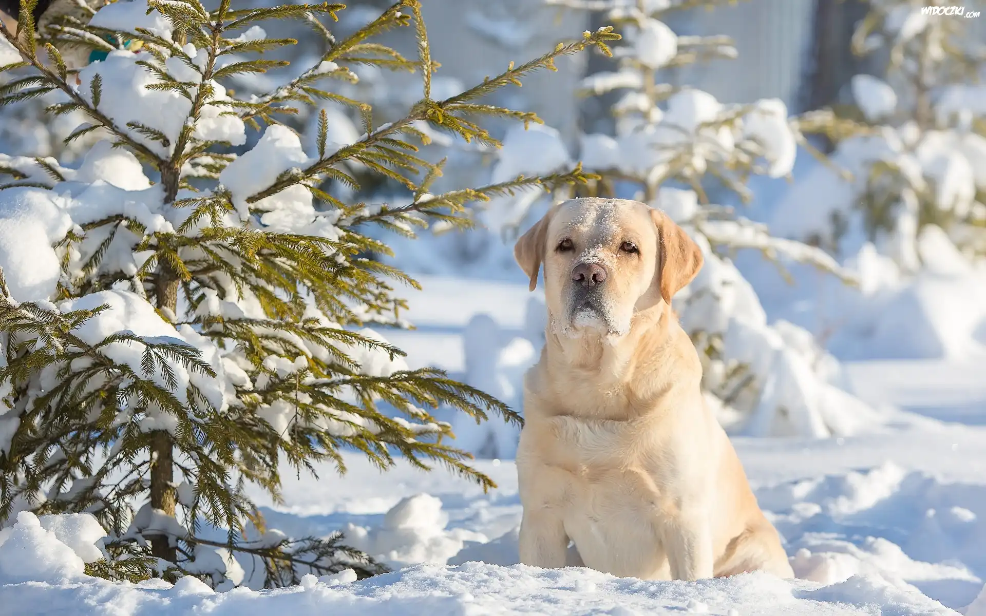 Zdjęcia, Labrador, Retriever, Śnieg, Zima, Iglaki