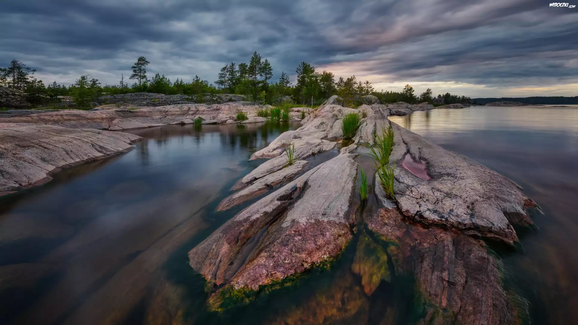 Rosja, Karelia, Jezioro, Ładoga, Skały, Chmury, Drzewa