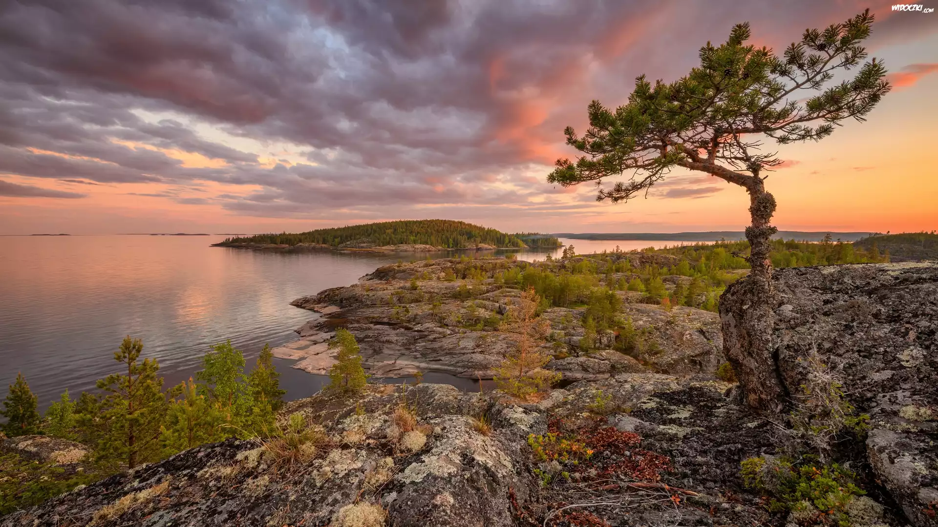 Zdjęcia, Rosja, Karelia, Jezioro, Ładoga, Skały, Jesień, Drzewo