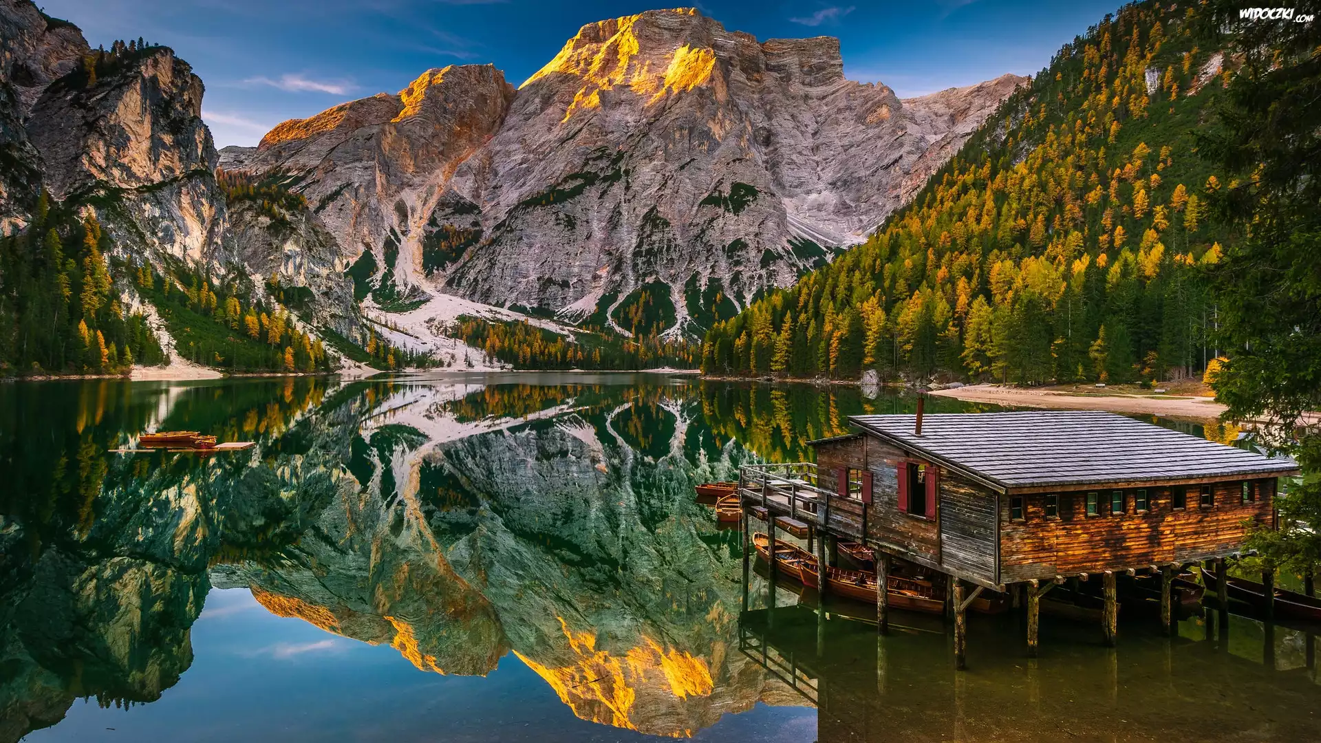 Włochy, Jezioro Pragser Wildsee, Lago di Braies, Góry Dolomity, Pomost, Drewniany, Domek, Łódki, Przystań |