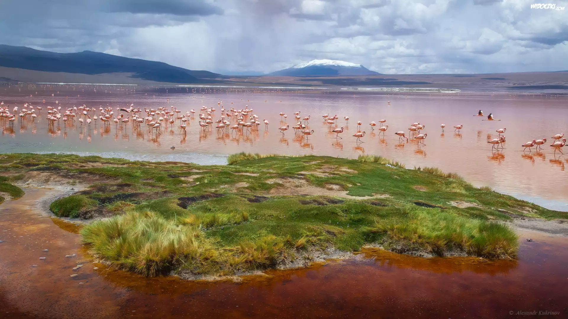 Zdjęcia, Jezioro, Laguna Colorada, Ptaki, Flamingi, Góry, Andy, Boliwia