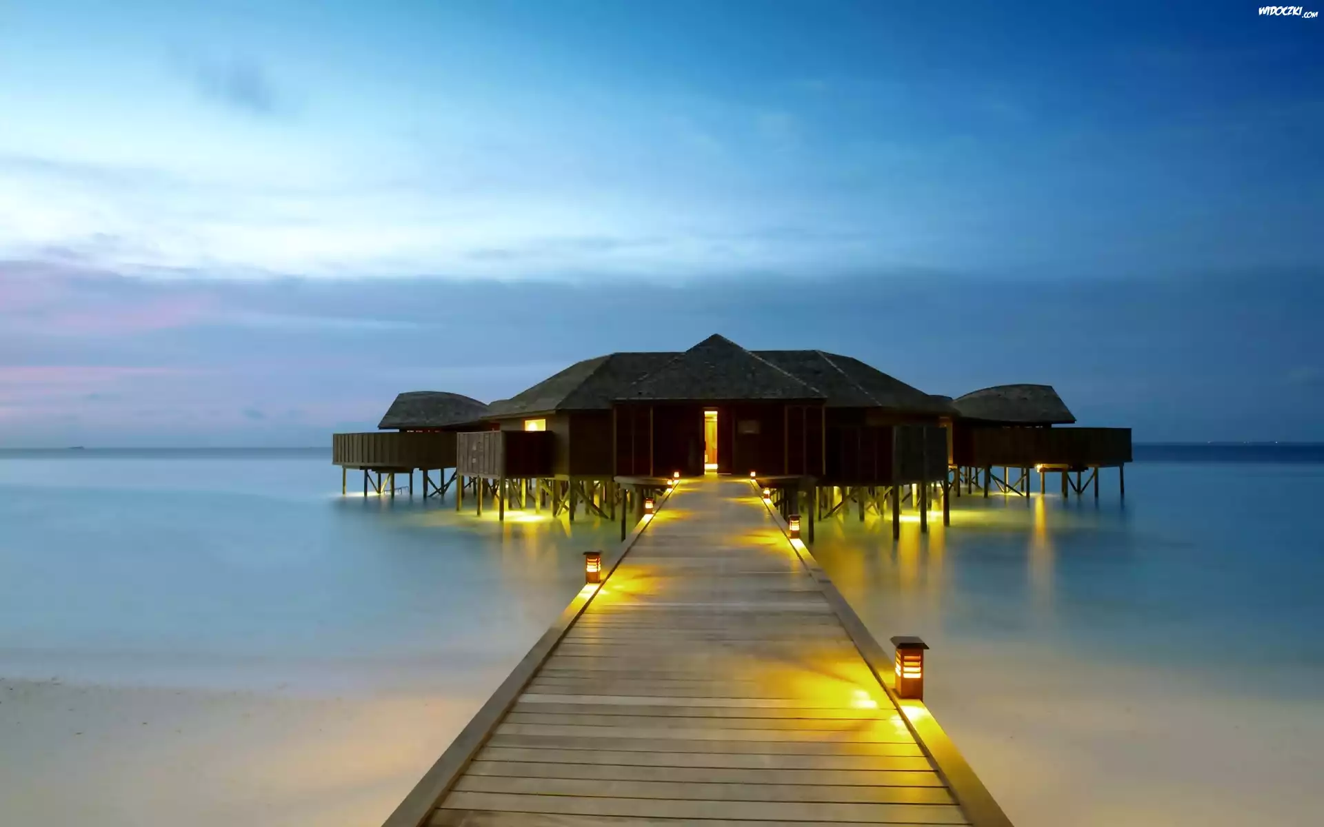 Wieczór, Laguna, Podświetlone, Molo, Domki, Na Palach