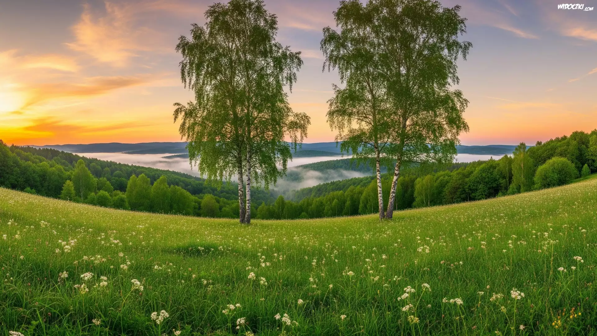 Lato, Drzewa, Brzozy, Łąka, Mgła, Wschód Słońca