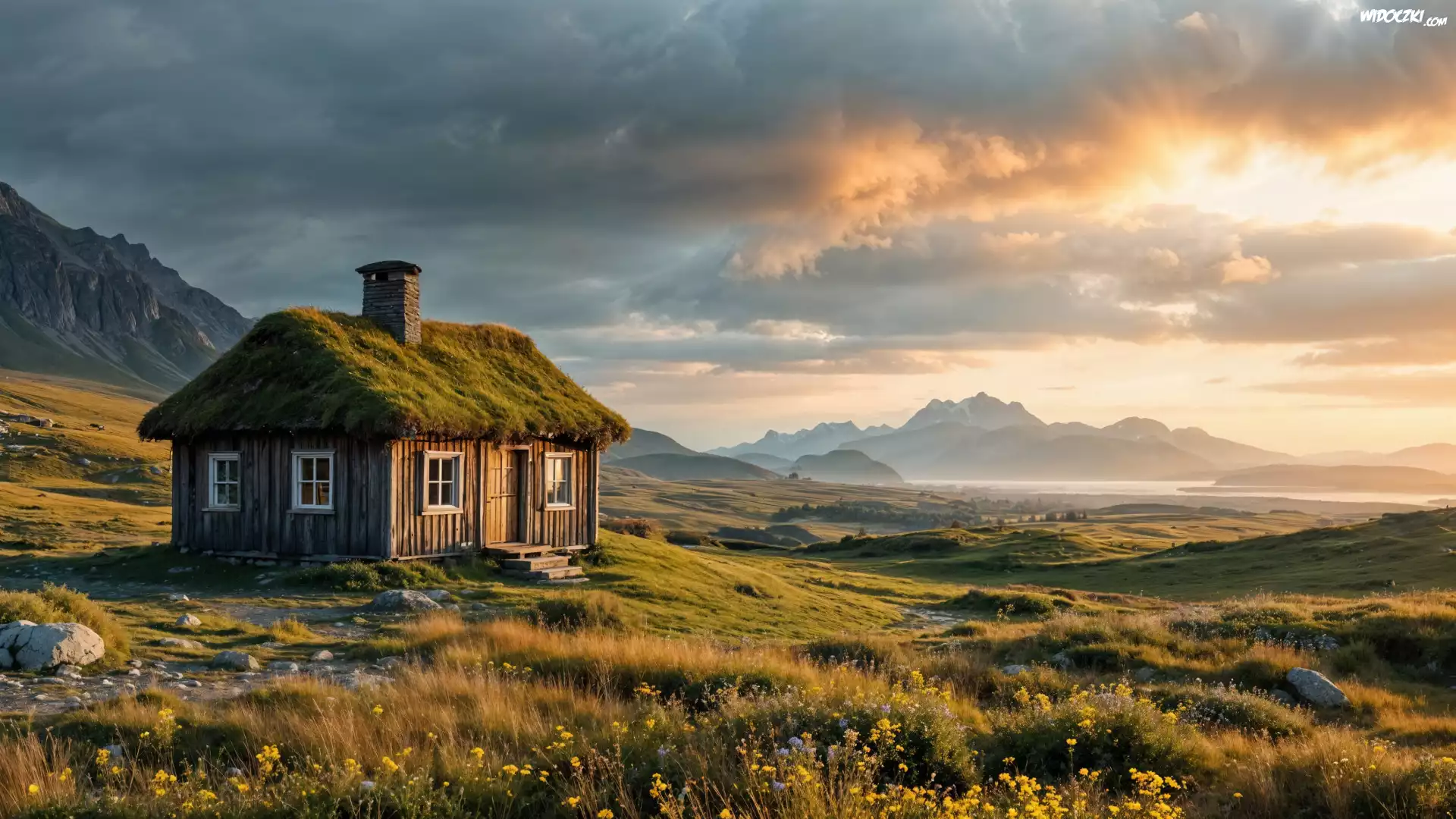 Zdjęcia, Góry, Drewniany, Dom, Łąka, Kwiaty, Niebo, Chmury