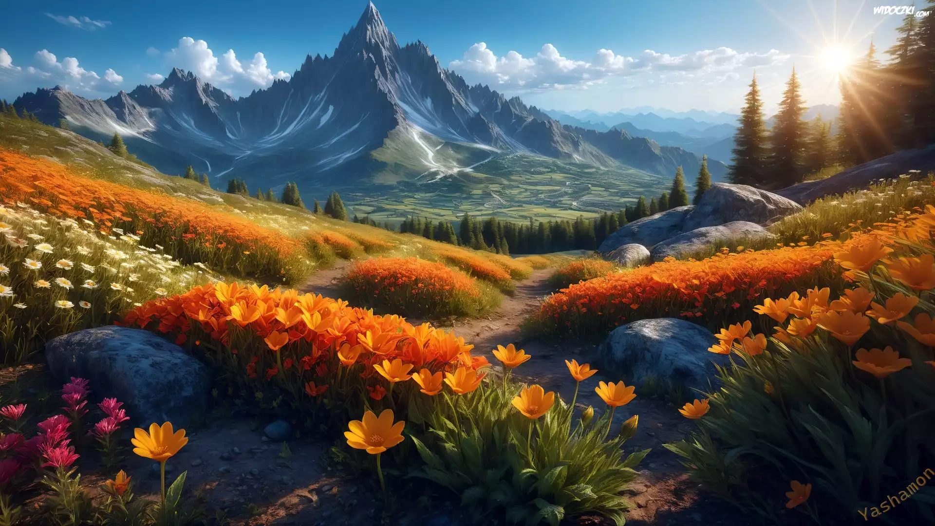 Góry, Kwiaty, Drzewa, Chmury, Promienie słońca, Grafika, , Łąka