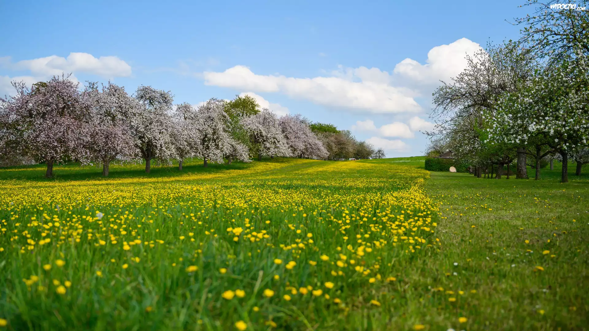Wiosna, Łąka, Drzewa owocowe, Mlecze