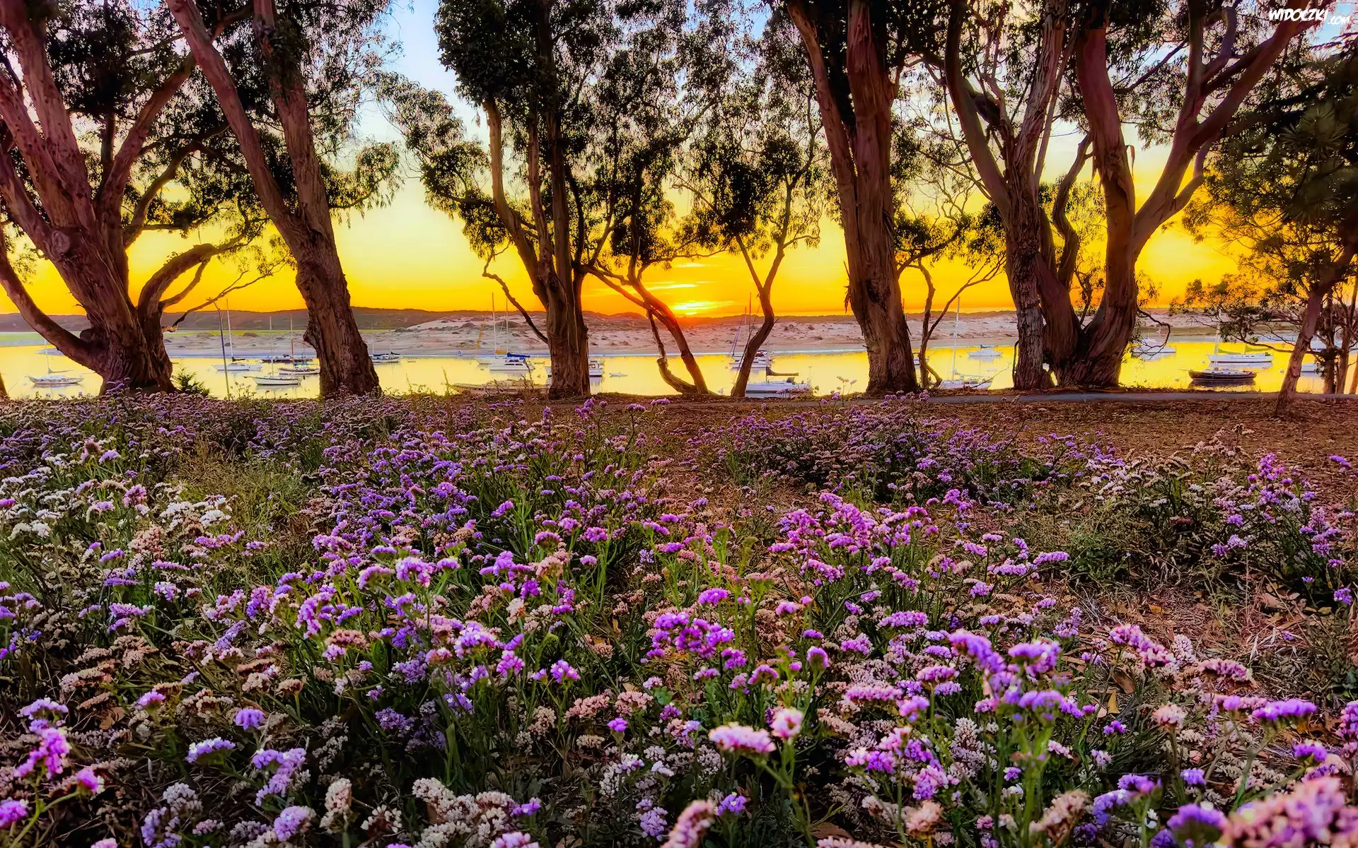 Zdjęcia, Jezioro, Zachód słońca, Łąka, Kwiaty, Drzewa