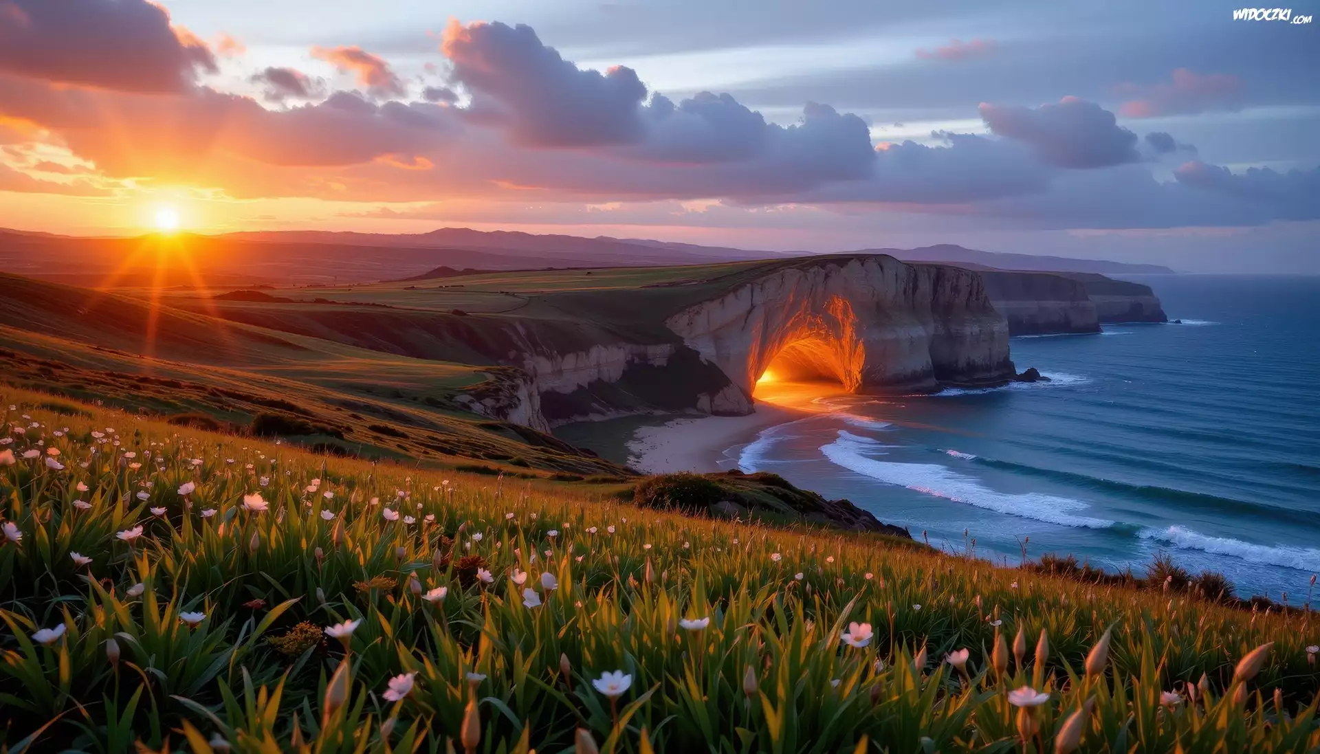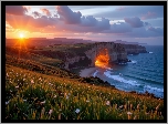 Zdjęcia, Łąka, Zbocze, Klif, Jaskinia, Światło, Morze, Zachód słońca, Grafika AI