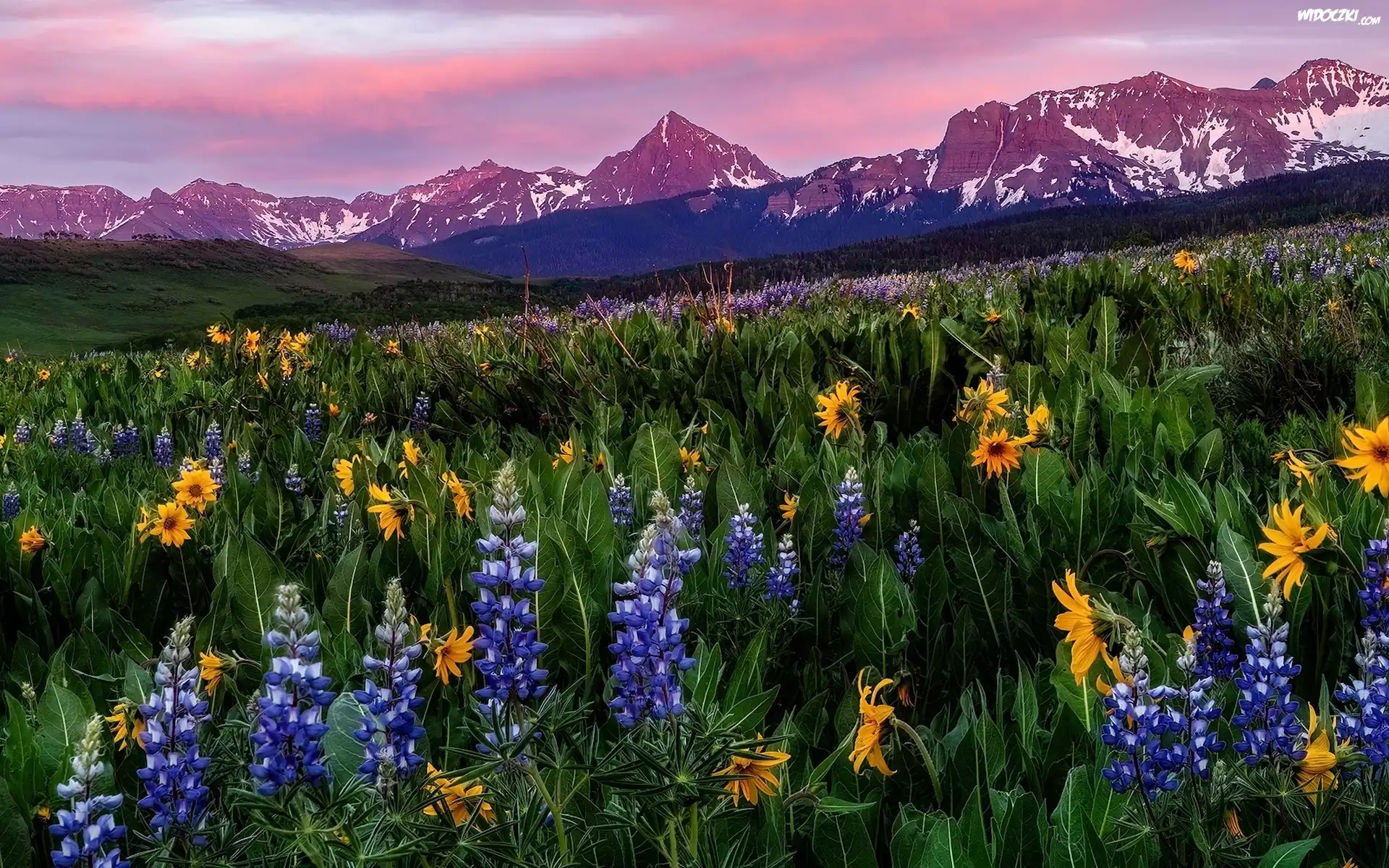Zdjęcia, Stany Zjednoczone, Kolorado, Góry, San Juan Mountains, Mount Sneffels, Łąka, Kwiaty, Łubin