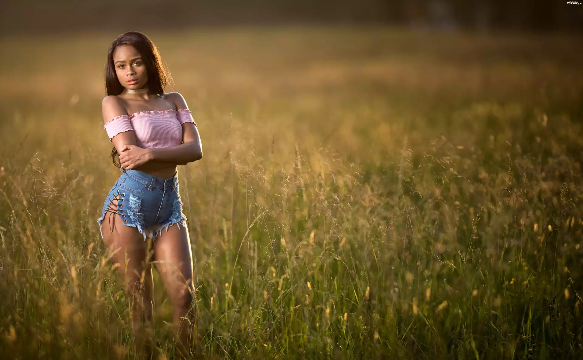 Zdjęcia, Ciemnoskóra, Dziewczyna, Krótkie, Spodenki, Bluzka, Trawa, Rozmycie, Łąka