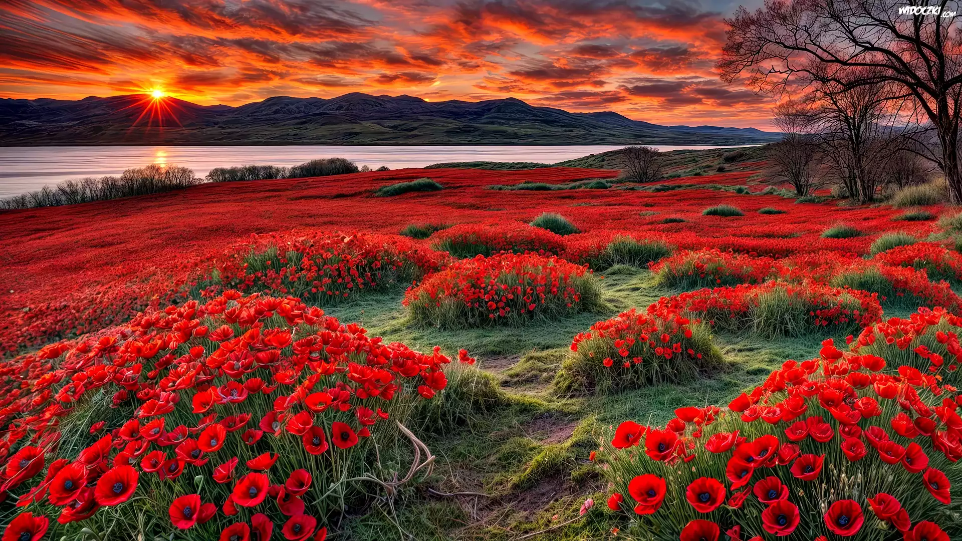 Maki, Czerwone, Kwiaty, Góry, Zachód słońca, Grafika, Łąka