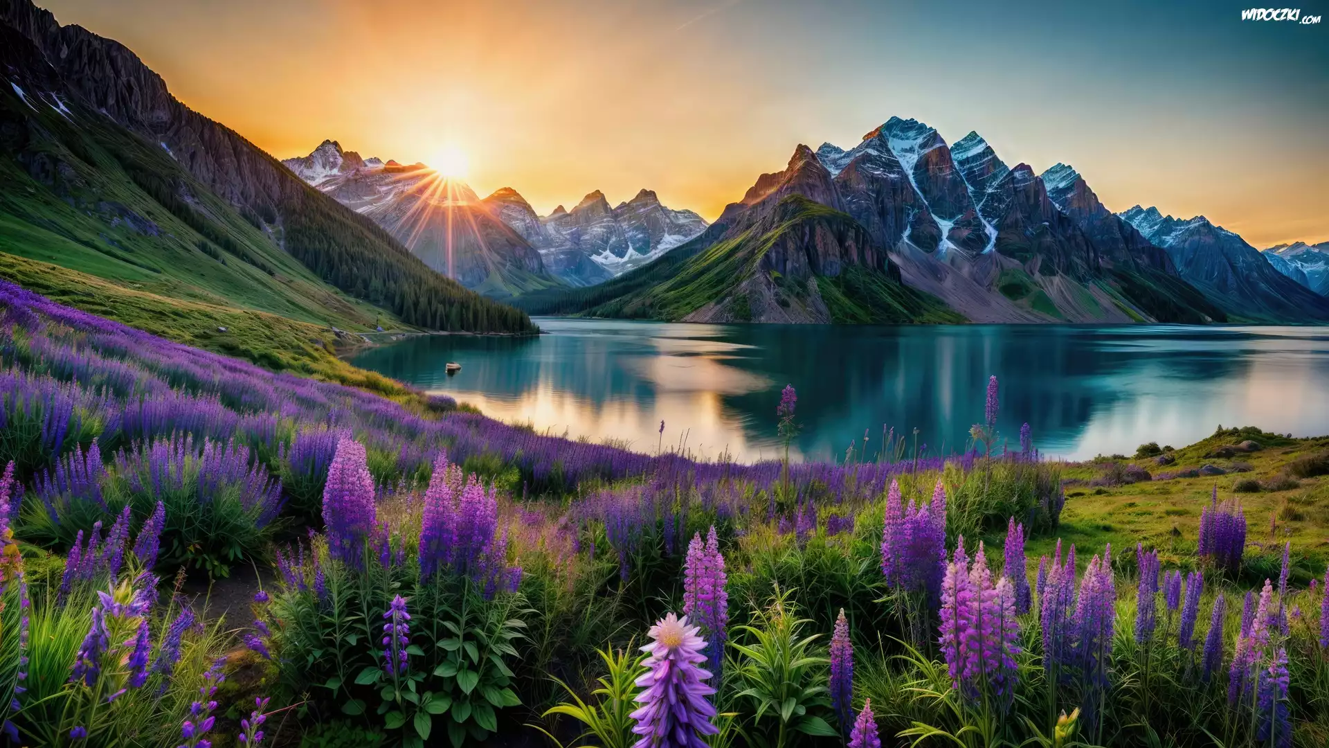 Zdjęcia, Gory, Jezioro, Las, Drzewa, Łubin, Wschód słońca, Łąka