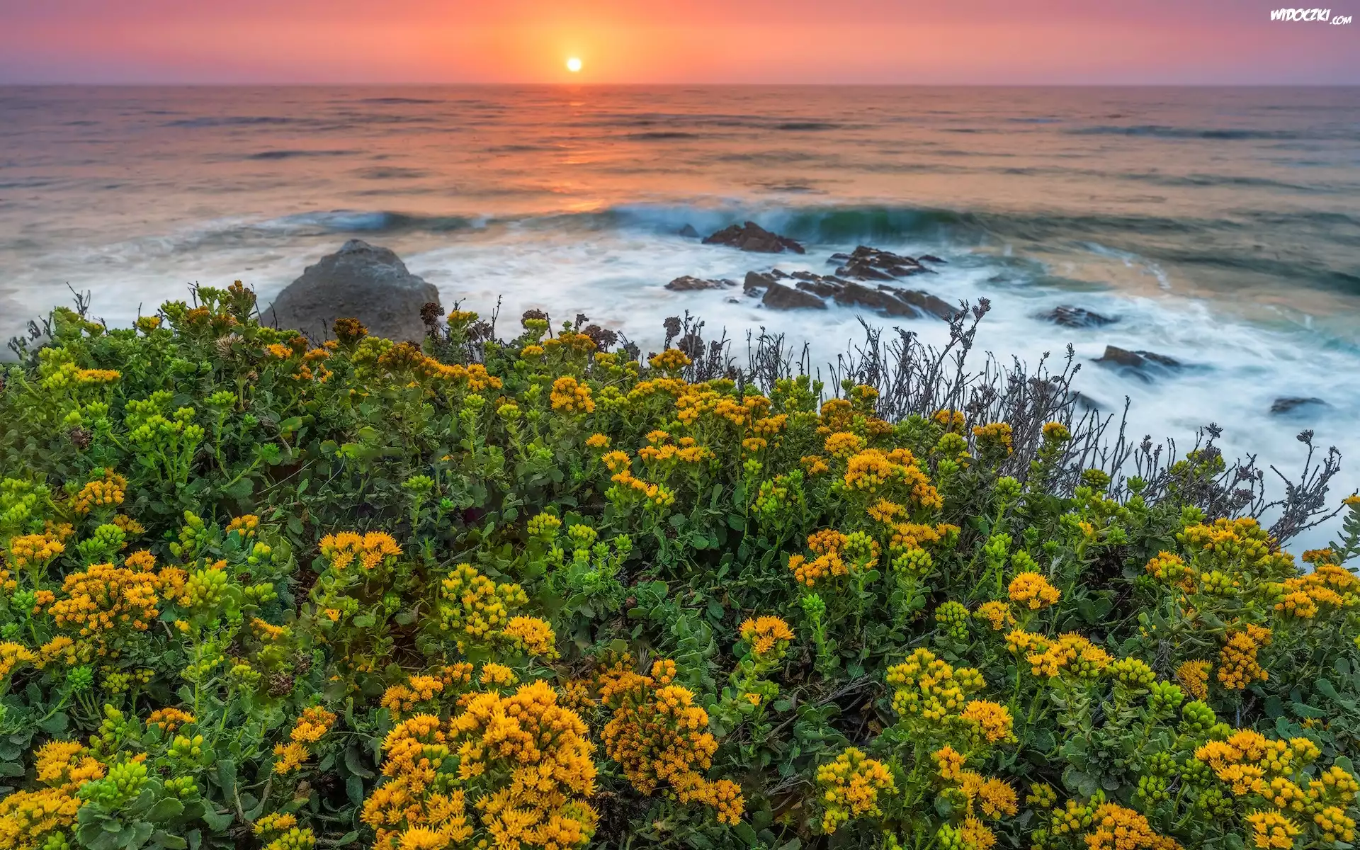 Zachód słońca, Morze, Łąka, Krzewy, Roślinność, Kwiaty