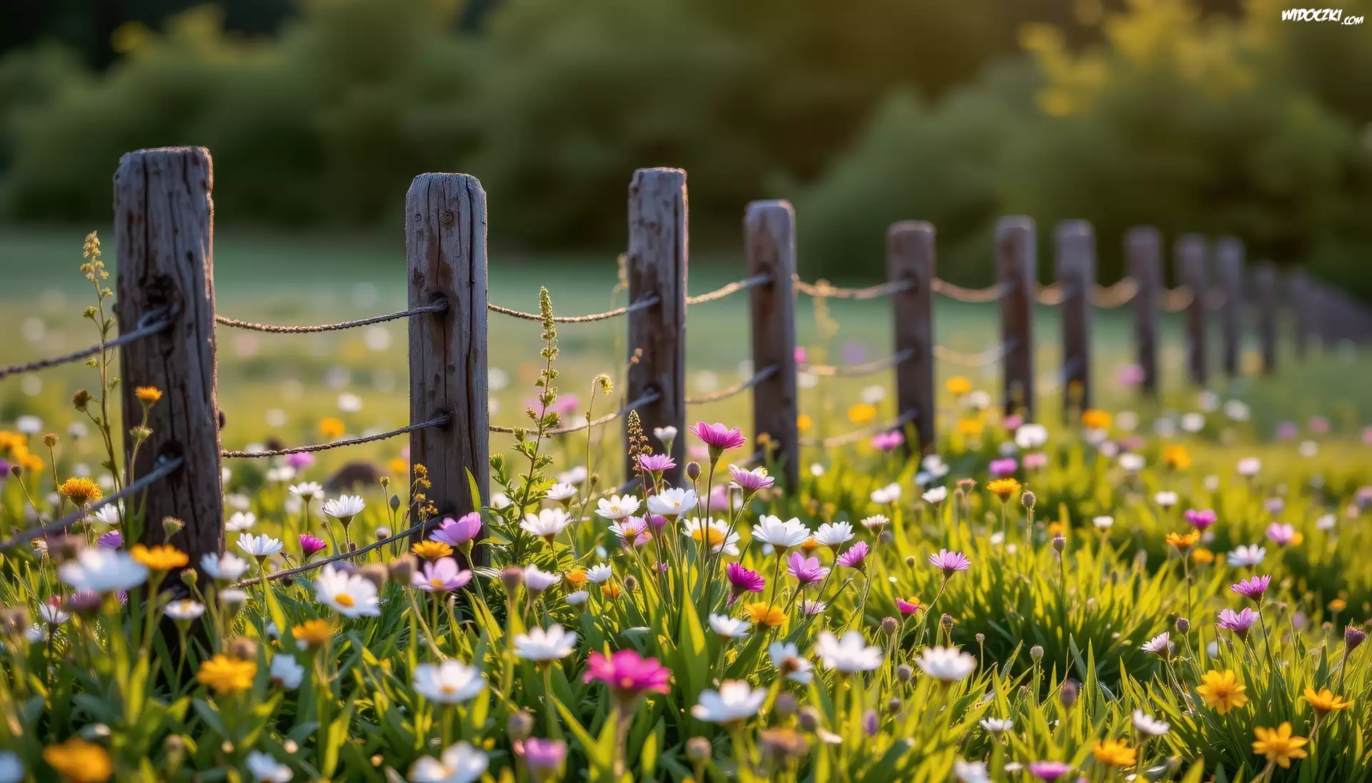 Zdjęcia, Łąka, Kwiaty, Ogrodzenie