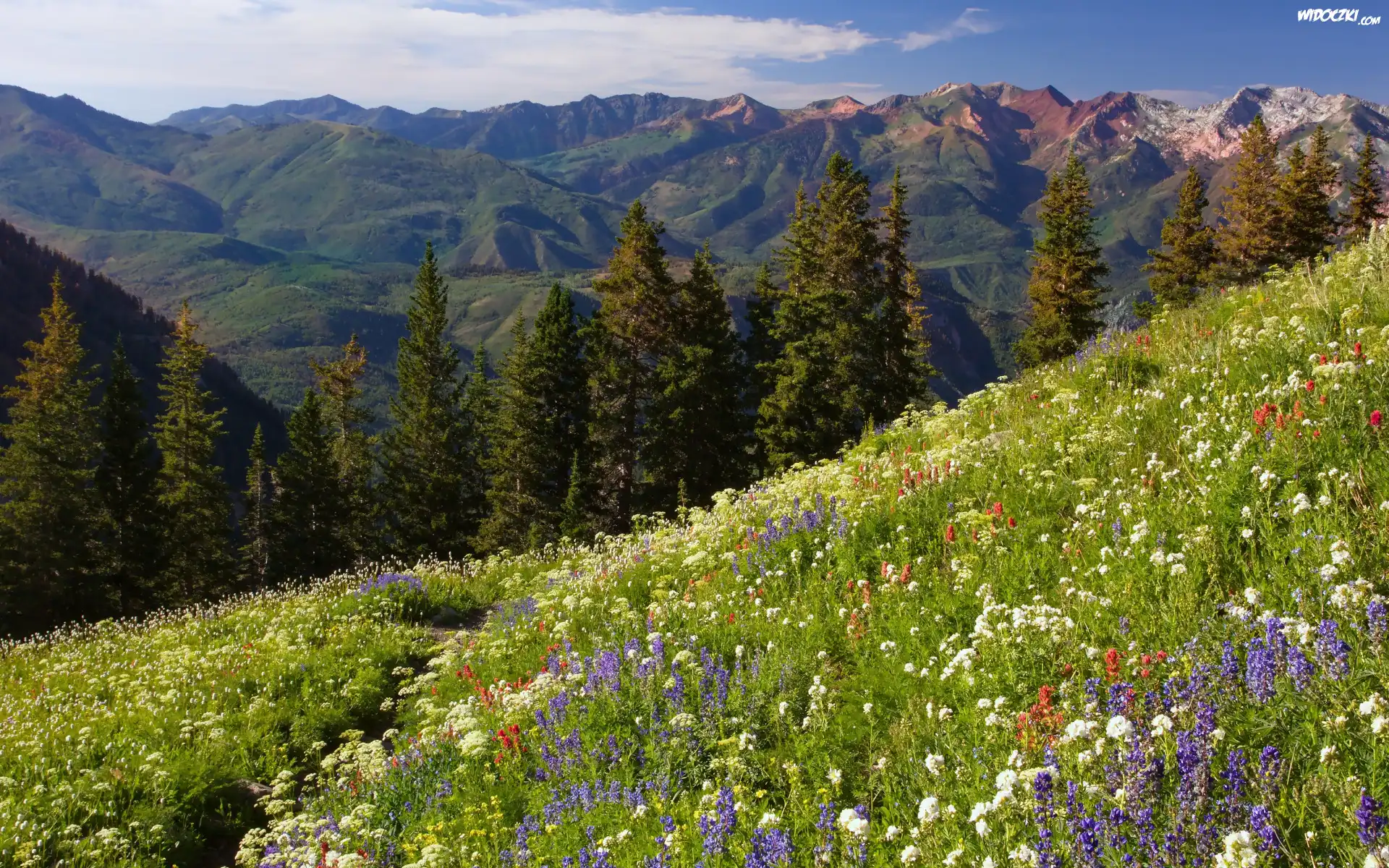 Góry, Drzewa, Polana, Łąka, Kwiaty, Ścieżka, Lato