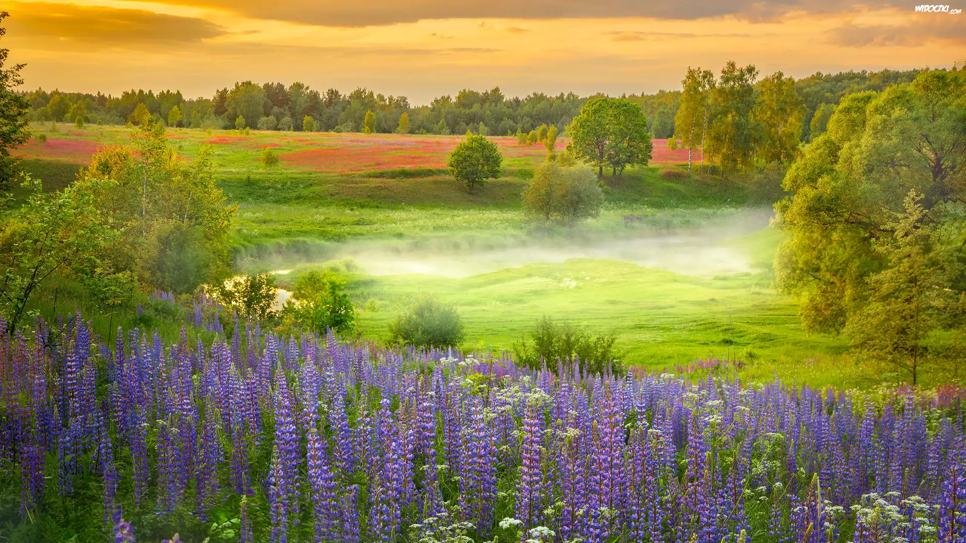 Łubin, Łąka, Pole, Drzewa, Mgła