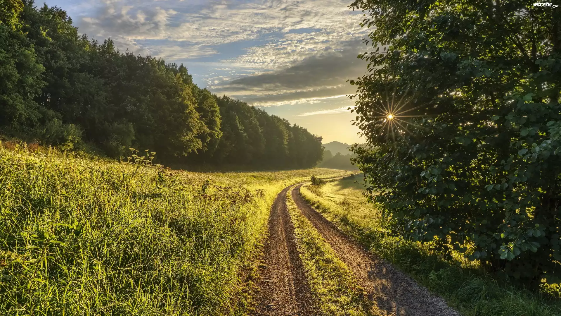 Łąka, Droga, Ścieżka, Las, Drzewa, Chmury, Promienie słońca, Poranek