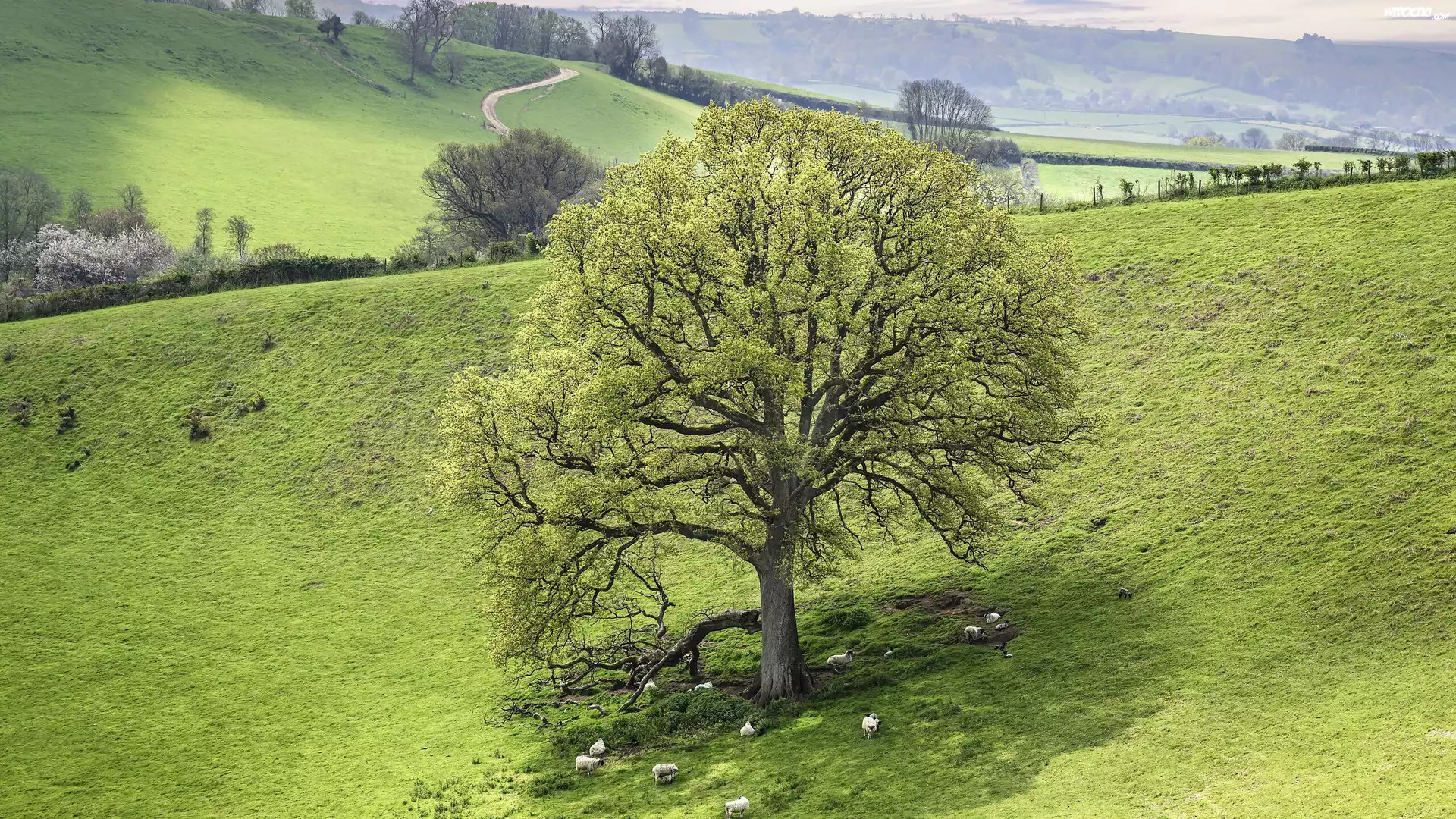 Zdjęcia, Drzewo, Łąka, Trawa, Owce, Wzgórze