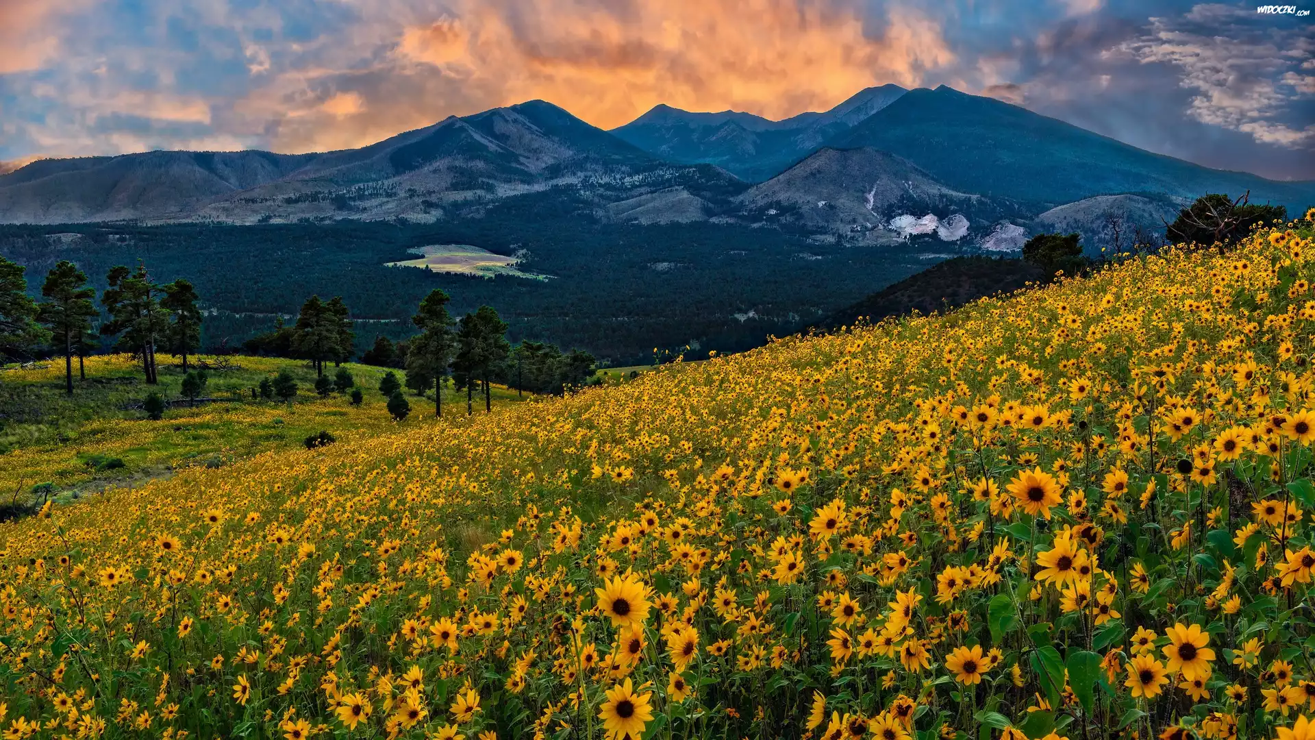 Zdjęcia, Góry, Łąka, Żółte, Kwiaty, Wzgórze