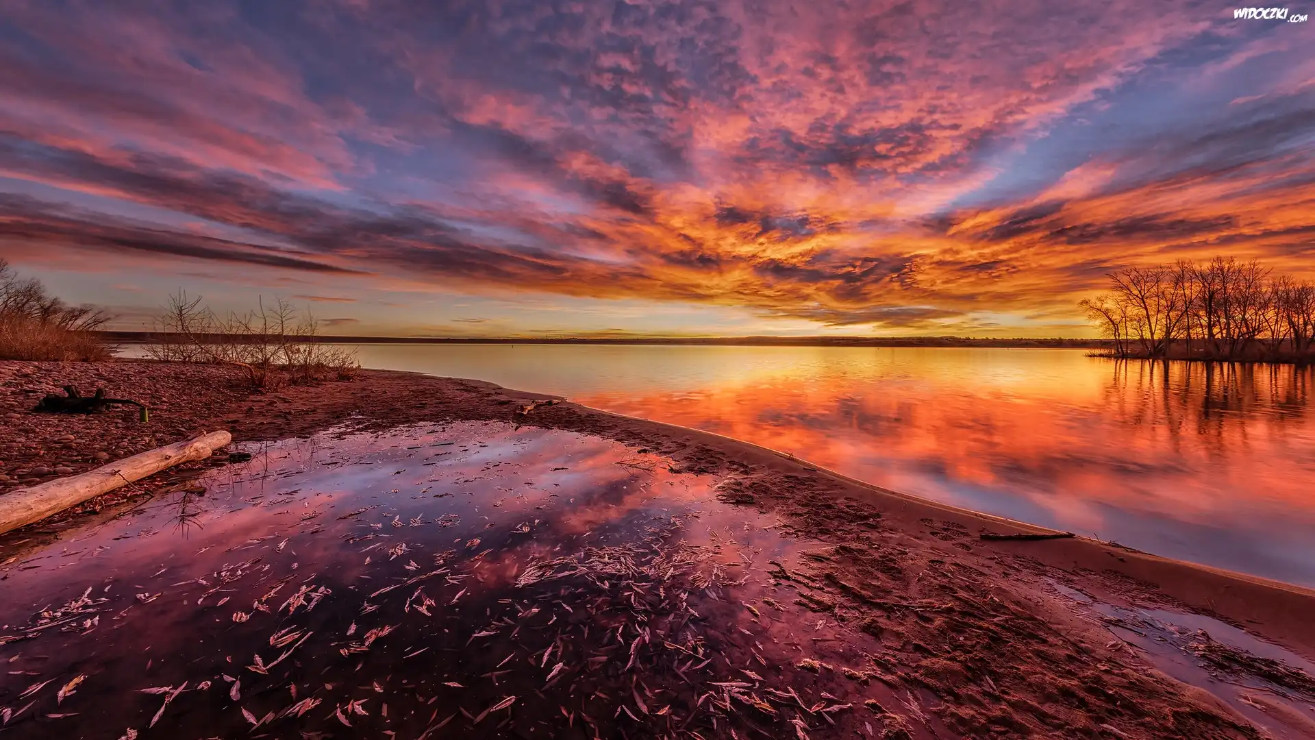 Wschód słońca, Chmury, Niebo, Drzewa, Jezioro, Lake Chatfield, Kolorado, Stany Zjednoczone