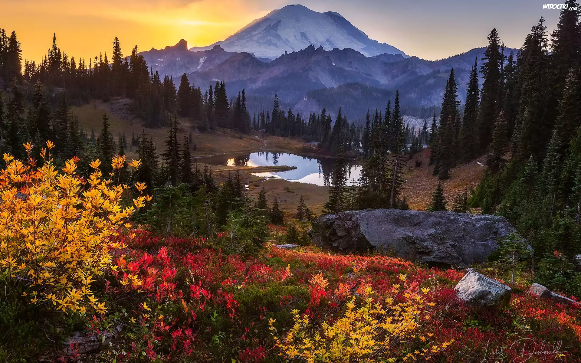 Zachód słońca, Stratowulkan Mount Rainier, Jezioro, Tipsoo Lake, Waszyngton, Stany Zjednoczone, Drzewa, Skała, Krzewy, Góry |