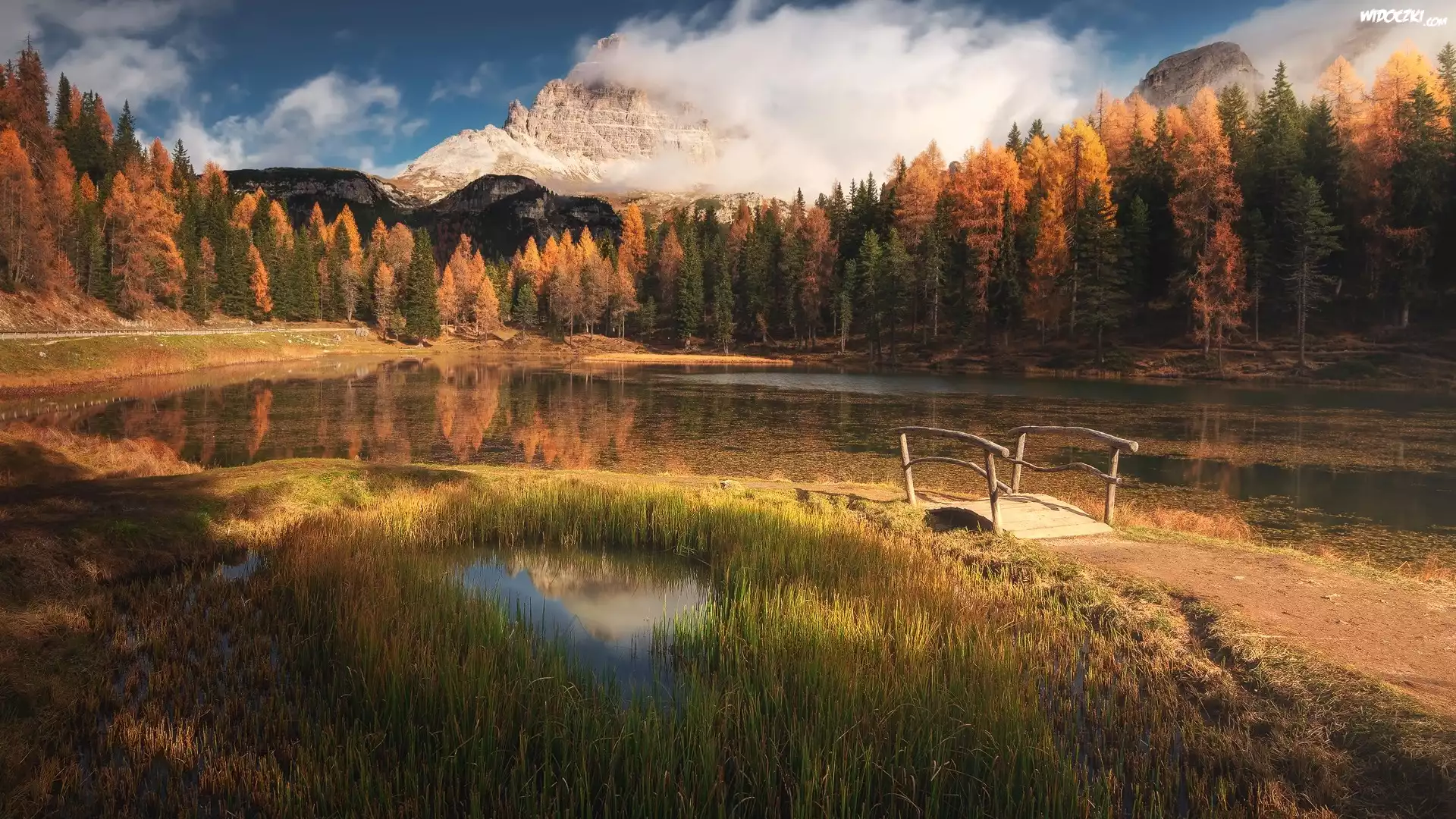 Zdjęcia, Jezioro, Antorno Lake, Mostek, Góry, Dolomity, Alpy, Drzewa, Jesień, Chmury, Włochy