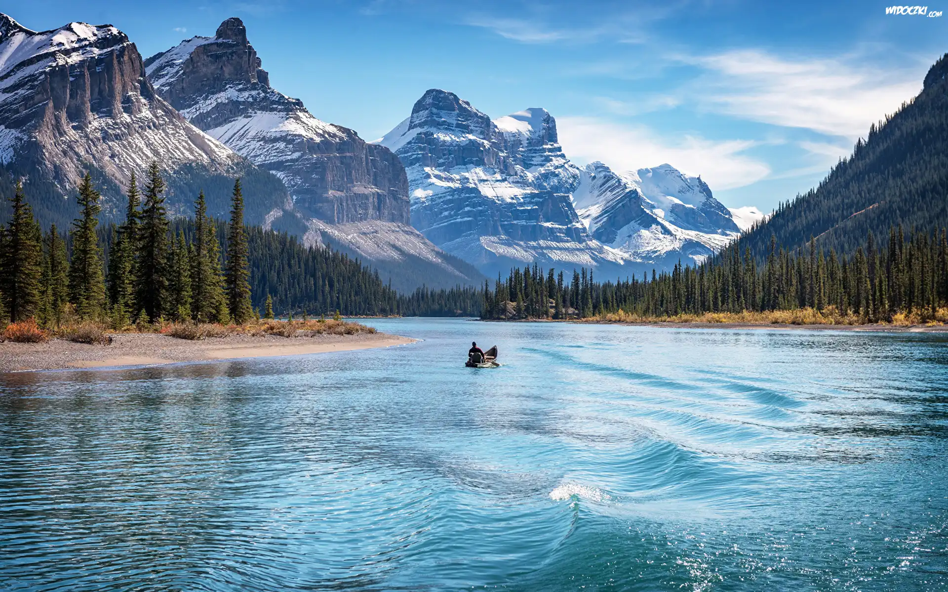Park Narodowy Jasper, Jezioro, Lake Maligne, Kajak, Człowiek, Góry, Drzewa, Lasy, Chmury, Alberta, Kanada |