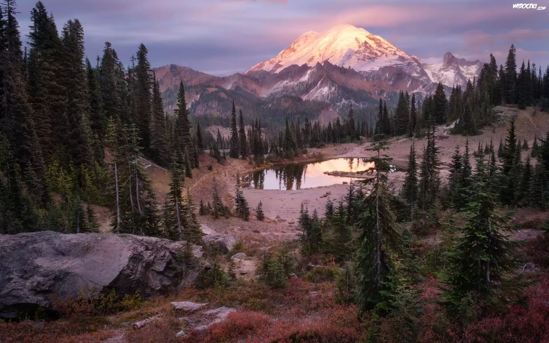 Stratowulkan, Góra, Mount Rainier, Drzewa, Jezioro, Tipsoo Lake, Park Narodowy Mount Rainier, Waszyngton, Stany Zjednoczone |