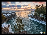 Stany Zjednoczone, Michigan, Drzewa, Jezioro, Superior Lake, Śnieg, Zima, Wschód słońca