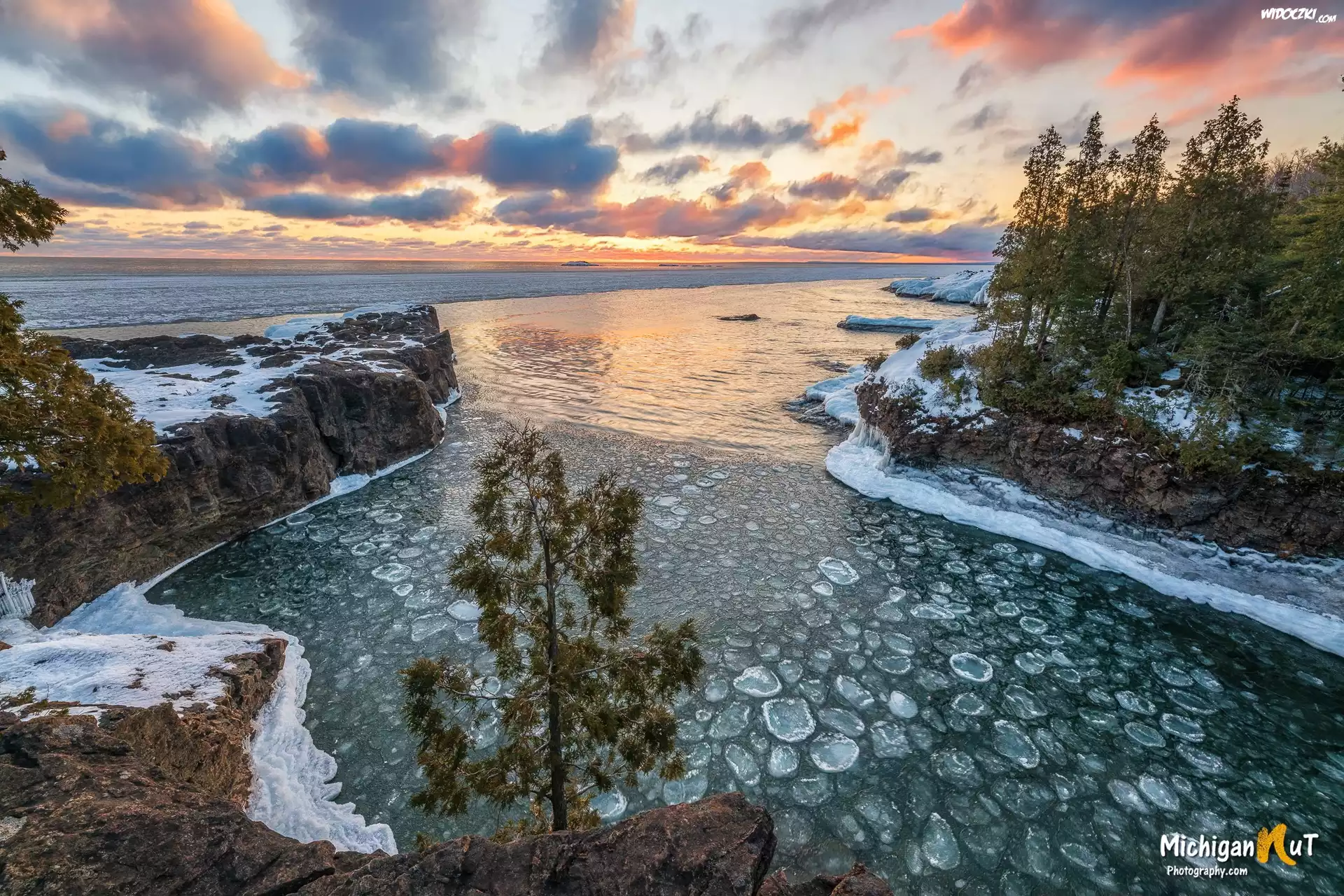 Zdjęcia, Stany Zjednoczone, Michigan, Drzewa, Jezioro, Superior Lake, Śnieg, Zima, Wschód słońca