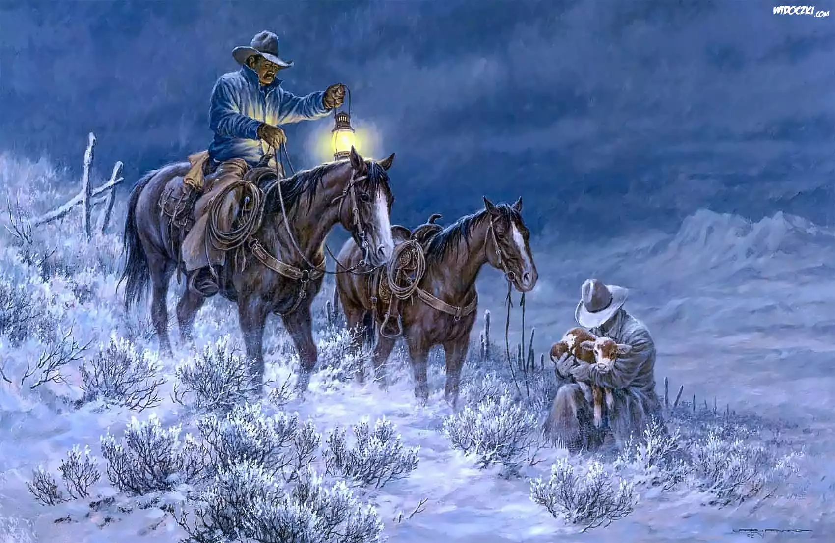 Obraz, Larry Fanning, Jeźdźcy, Kowboje, Konie, Zima