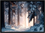 Zima, Drzewa, Droga, Las, Grafika AI